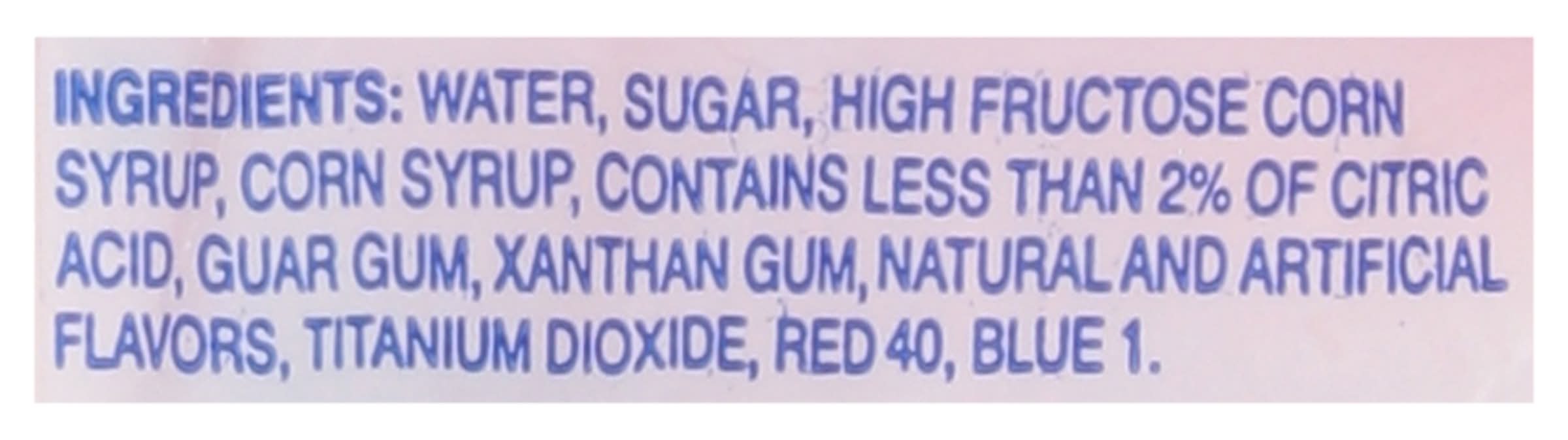 Ingredients: Water, Sugar, High Fructose Corn Syrup, Corn Syrup, Contains Less than 2% of Citric Acid, Guar Gum, Xanthan Gum, Natural and Artificial Flavors, Titanium Dioxide, Red 40, Blue 1
