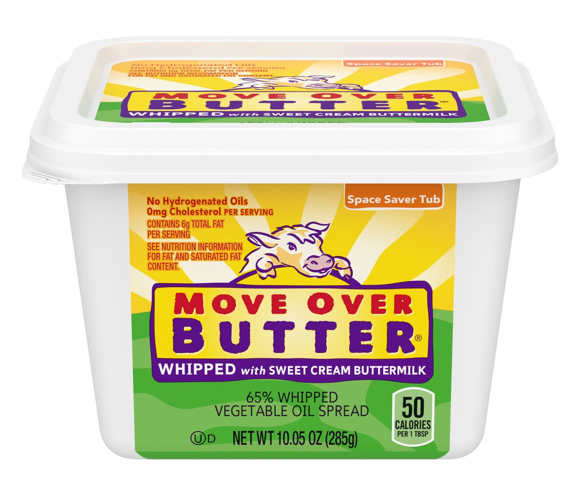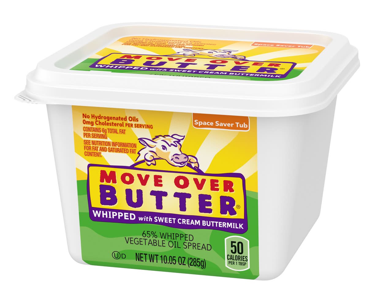 Make room in your fridge for MOVE OVER BUTTER Whipped Vegetable Oil Spread. Whipped with sweet cream buttermilk, this soft spread provides less fat than butter with a great taste. Each serving contains 50 calories and 5 less grams of fat than real butter. Pick up a space-saver tub of MOVE OVER BUTTER to spread on your homemade dinner rolls or warm biscuits straight from the oven. With no hydrogenated oil, this whipped soft spread also makes a great alternative to butter in baking recipes. Add great taste with MOVE OVER BUTTER Whipped Soft Spread.