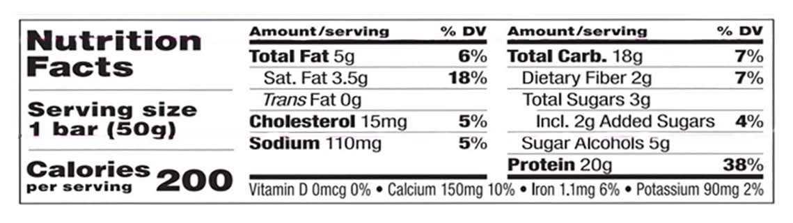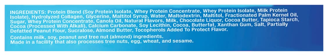 Ingredients: Protein Blend (Soy Protein Isolate, Whey Protein Concentrate, Whey Protein Isolate, Milk Protein Isolate), Hydrolyzed Collagen, Glycerine, Maltitol Syrup, Water, Maltodextrin, Maltitol, Fractionated Palm Kernel Oil, Sugar, Whey Protein Concentrate, Canola Oil, Natural Flavors, Milk, Chocolate Liquor, Cocoa Butter, Tapioca Starch, Cocoa (Processed with Alkali), Calcium Carbonate, Soy Lecithin, Cocoa, Butterfat, Xanthan Gum, Salt, Partially Defatted Peanut Flour, Sucralose, Almond Butter, Tocopherols Added to Protect Flavor Contains: Soybeans, Milk, Tree Nuts, Almonds, Peanuts, Tree Nuts, Eggs, Wheat, Sesame