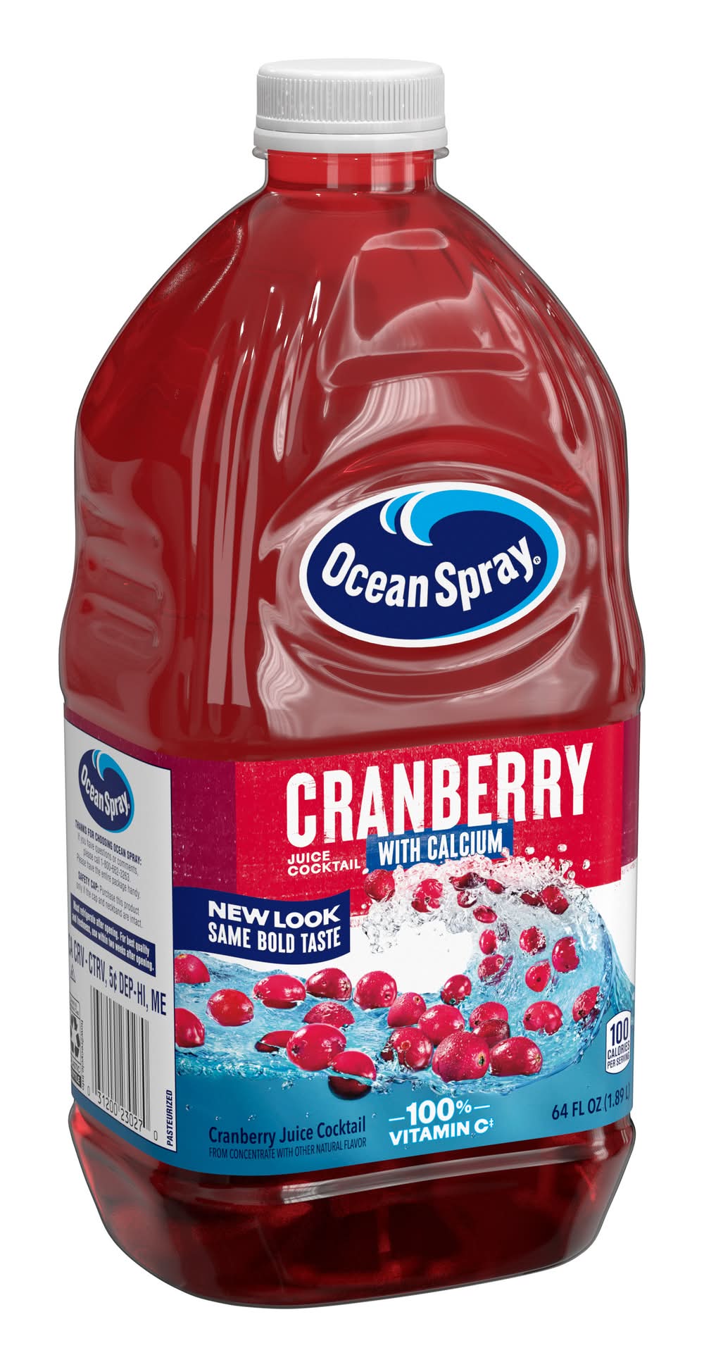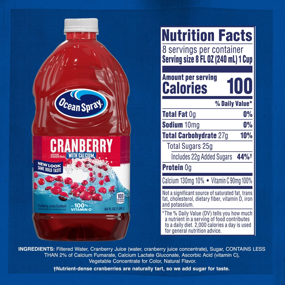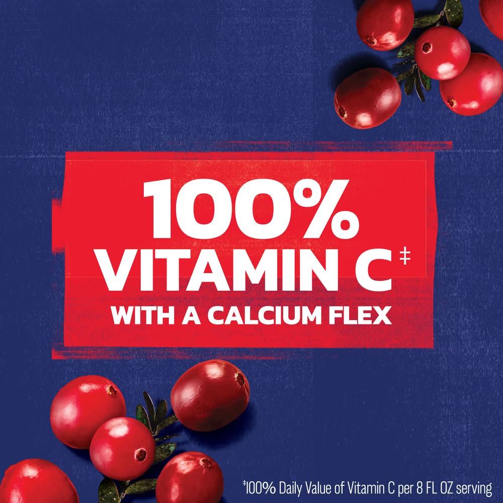 100% Vitamin C. The perfect juice drink with mighty cranberry and a calcium flex. • Flavor: Cranberry • Ocean Spray Cranberries, Inc., Lakeville-Middleboro,MA,02349,US • Packaging: Reusable