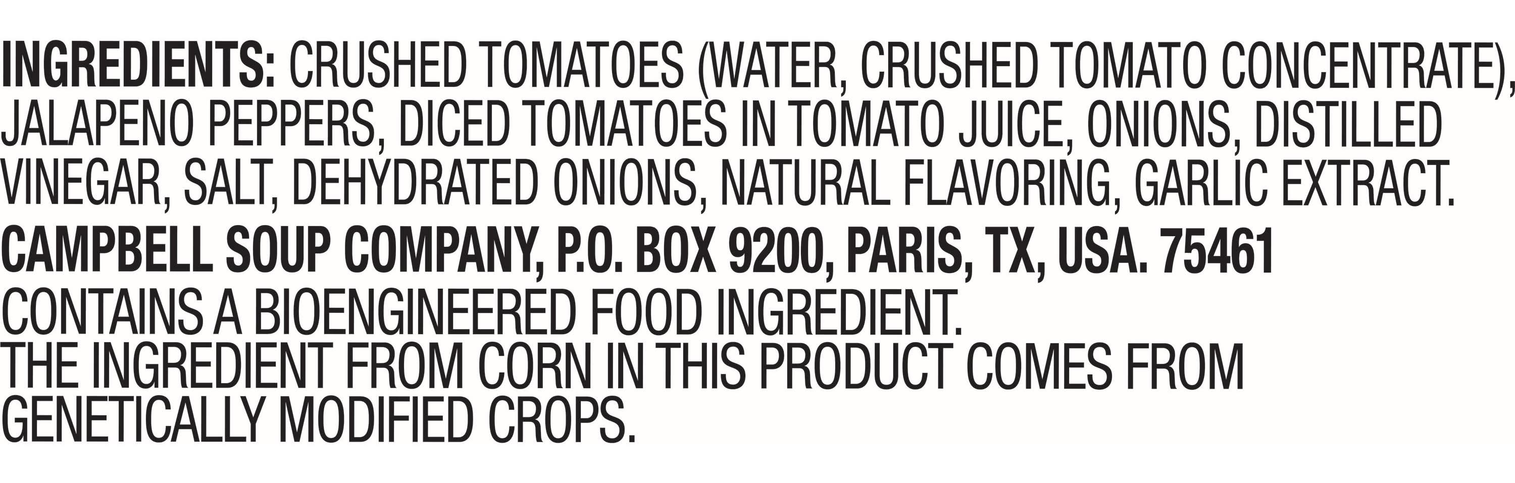 Ingredients: Crushed Tomatoes (Water Crushed Tomato Concentrate), Jalapeno Peppers, Diced Tomatoes in Tomato Juice, Fresh Onions, Distilled Vinegar, Dehydrated Onions, Salt, Garlic, Natural Flavoring Additives: Genetically Modified Ingredients
