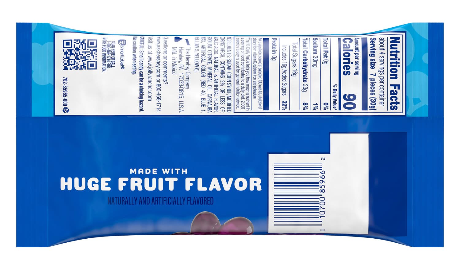 Ingredients: SUGAR, CORN SYRUP, MODIFIED CORNSTARCH, CONTAINS 2% OR LESS OF: MALIC ACID, NATURAL ARTIFICIAL FLAVOR, SODIUM CITRATE, MINERAL OIL, CARNAUBA WAX, ARTIFICIAL COLOR (RED 40, BLUE 1, YELLOW 5, YELLOW 6), . Contains: Contains: Does Not Contain Any Of The 8 Major Allergens