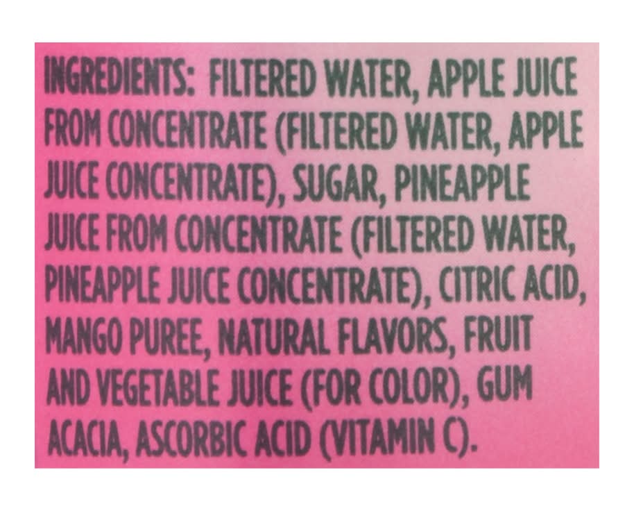 Ingredients: Filtered Water, Apple Juice from Concentrate (Filtered Water, Apple Juice Concentrate), Sugar, Pineapple Juice from Concentrate (Filtered Water, Pineapple Juice Concentrate), Citric Acid, Mango Puree, Natural Flavors, Fruit and Vegetable Juice (for Color), Gum Acacia, Ascorbic Acid (Vitamin C)