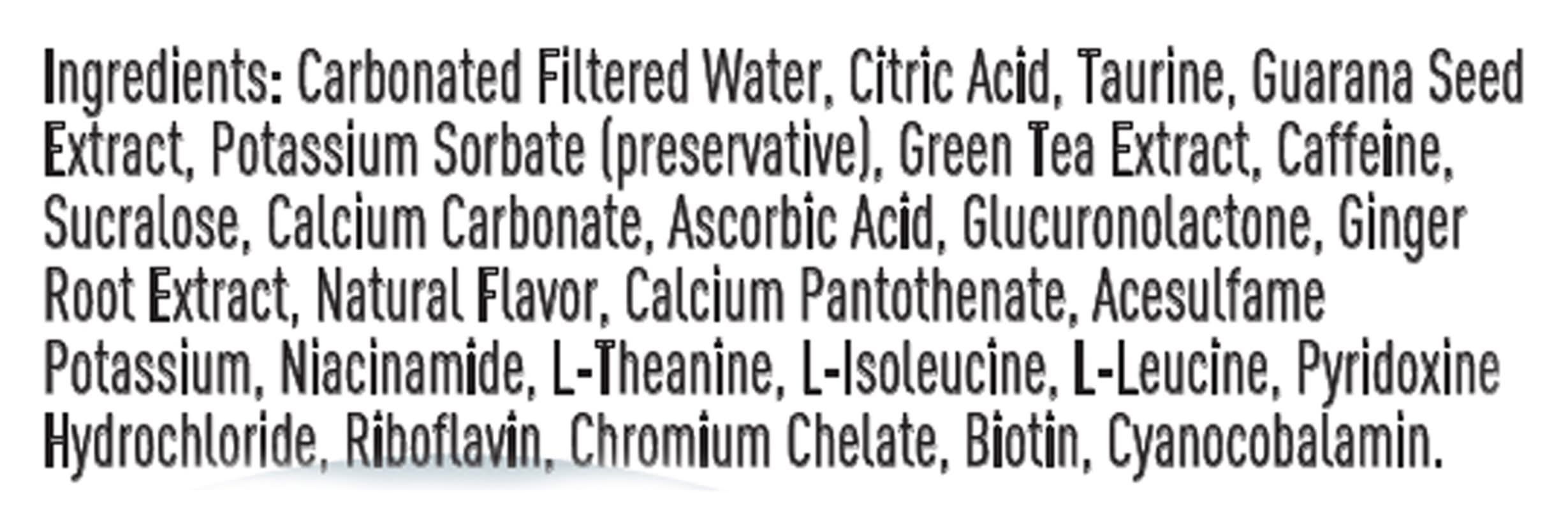 Ingredients: Carbonated Filtered Water, Citric Acid, Taurine, Guarana Seed Extract, Potassium Sorbate (Preservative), Green Tea Extract, Caffeine, Sucralose, Calcium Carbonate, Ascorbic Acid, Glucuronolactone, Ginger Root Extract, Natural Flavor, Calcium Pantothenate, Acesulfame Potassium, Niacinamide, L-Theanine, L-Isoleucine, L-Leucine, Pyridoxine Hydrochloride, Riboflavin, Chromium Chelate, Biotin, Cyanocobalamin Contains 270mg of caffeine