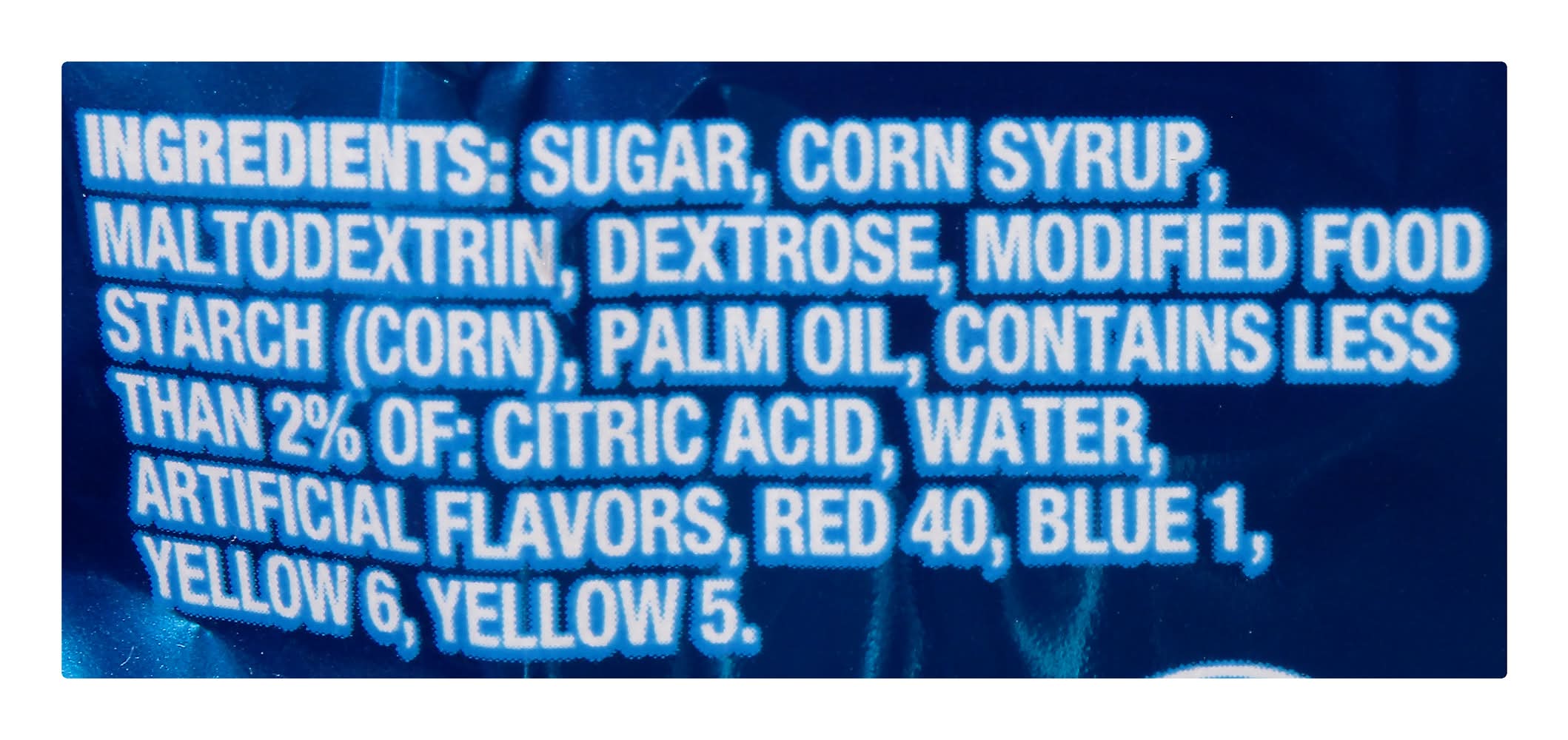 Ingredients: Sugar, Corn Syrup, Maltodextrin, Dextrose, Food Starch-Modified, Palm Oil, Contains Less than 2% of: Citric Acid, Water, Artificial Flavors, Red 40, Blue 1 Yellow 6, Yellow 5
