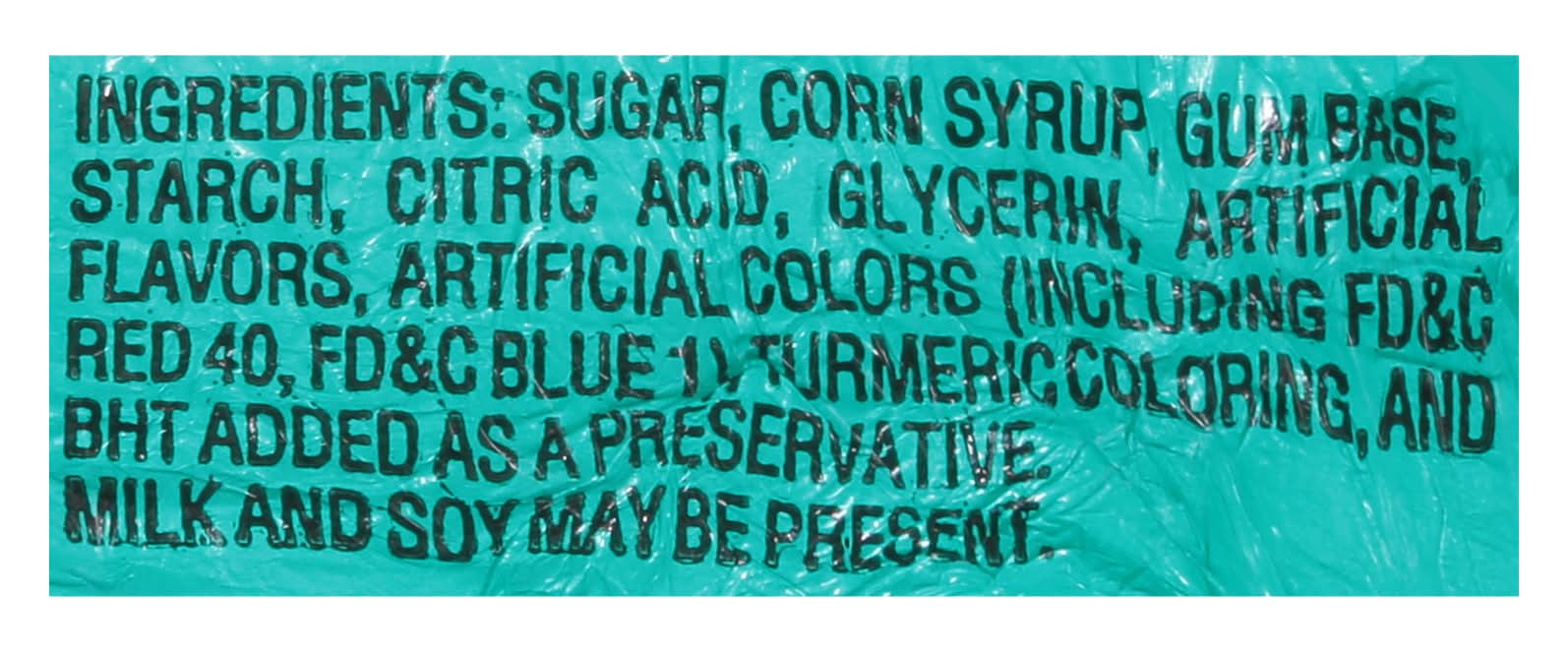Ingredients: Sugar, Corn Syrup, Gum Base, Starch, Citric Acid, Glycerin, Artificial Flavors, Artificial Colors (Including FD&C Red 40, FD&C Blue 1), Turmeric Coloring, and BHT Added as a Preservative Contains: Milk, Soybeans