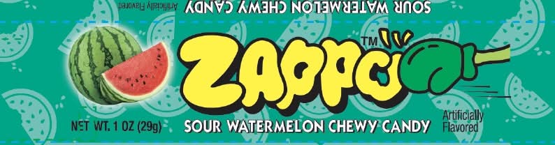 A chewy watermelon flavored taffy. • Brand: Zappo • Flavor: Watermelon