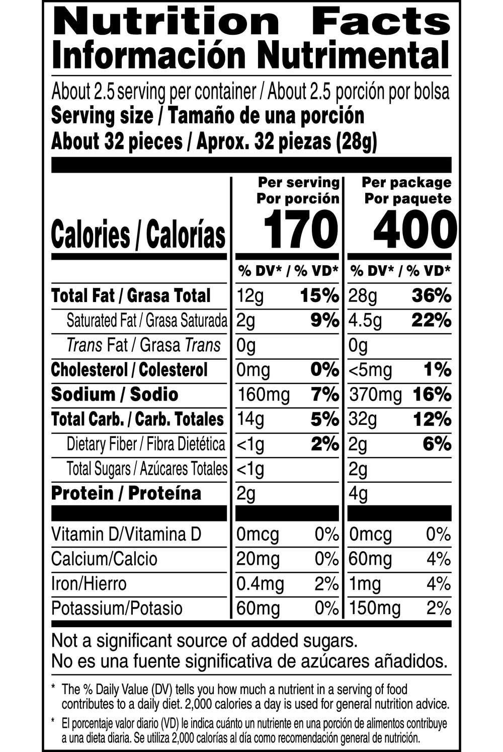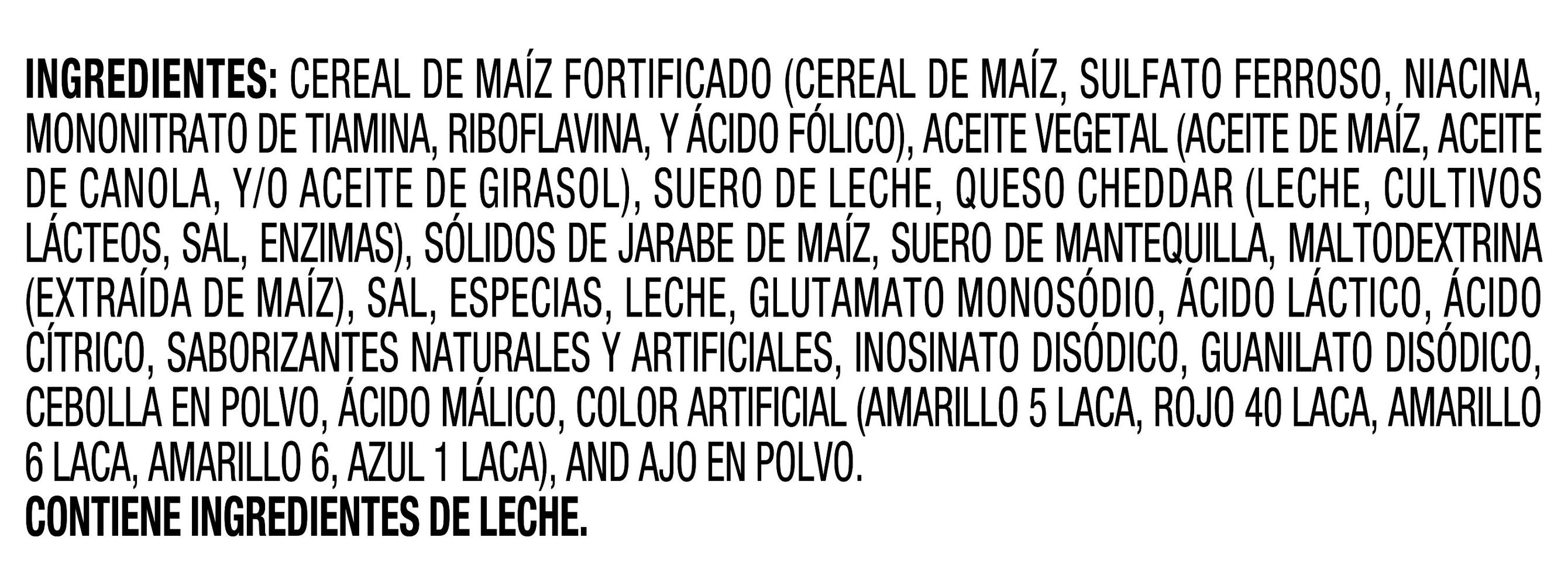 Ingredients: Enriched Corn Meal (Corn Meal, Ferrous Sulfate, Niacin, Thiamin Mononitrate, Riboflavin, Folic Acid), Vegetable Oil (Corn, Canola, And/Or Sunflower Oil), Whey, Cheddar Cheese (Pasteurized Milk, Cheese Cultures, Salt, Enzymes), Corn Syrup Solids, Buttermilk, Maltodextrin (Made From Corn), Salt, Spices, Whole Milk, Monosodium Glutamate, Lactic Acid, Citric Acid, Natural And Artificial Flavors, Disodium Inosinate, Disodium Guanylate, Onion Powder, Malic Acid, Artificial Color (Yellow 5 Lake, Red 40 Lake, Yellow 6 Lake, Yellow 6, Blue 1 Lake), And Garlic Powder. CONTAINS MILK INGREDIENTS. Contains: Contains Milk Ingredients.