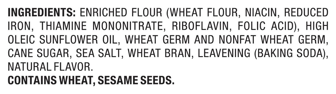 Ingredients: Enriched Flour (Wheat Flour, Niacin, Reduced Iron, Thiamine Mononitrate, Riboflavin, Folic Acid), High Oleic Sunflower Oil, Wheat Germ and Nonfat Wheat Germ, Cane Sugar, Sea Salt, Wheat Bran, Leavening (Baking Soda), Natural Flavor Contains: Wheat, Sesame