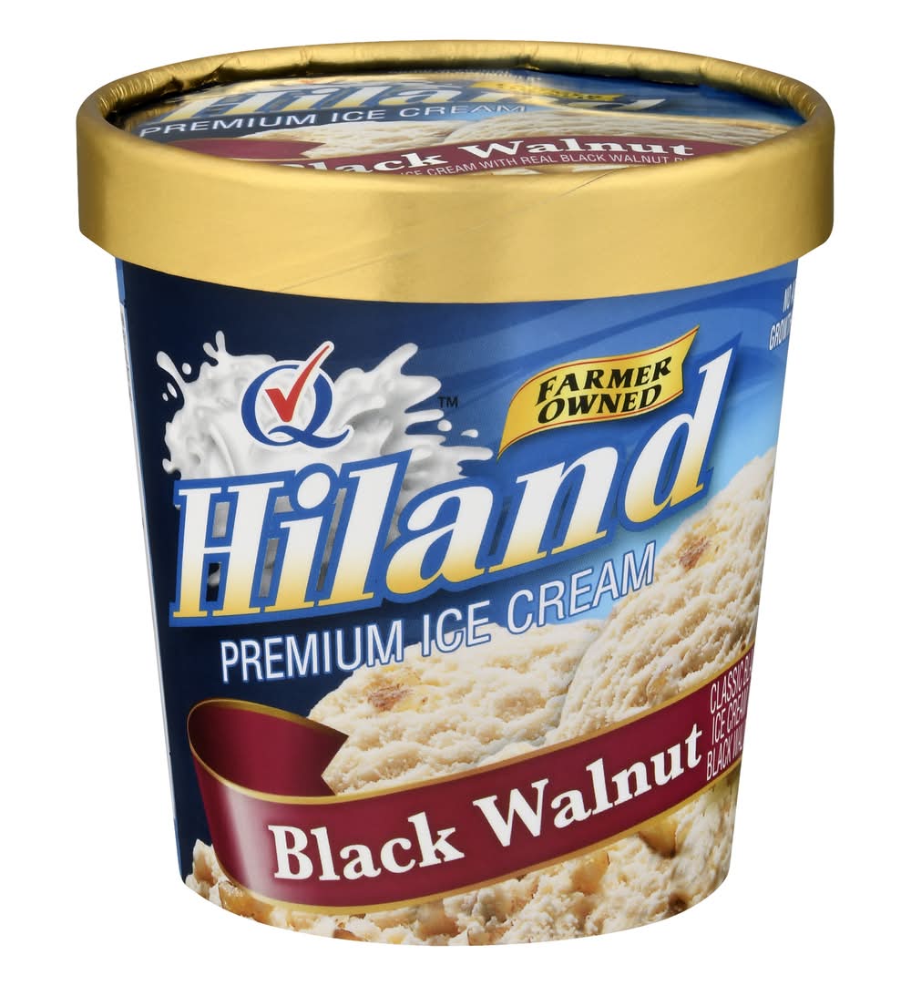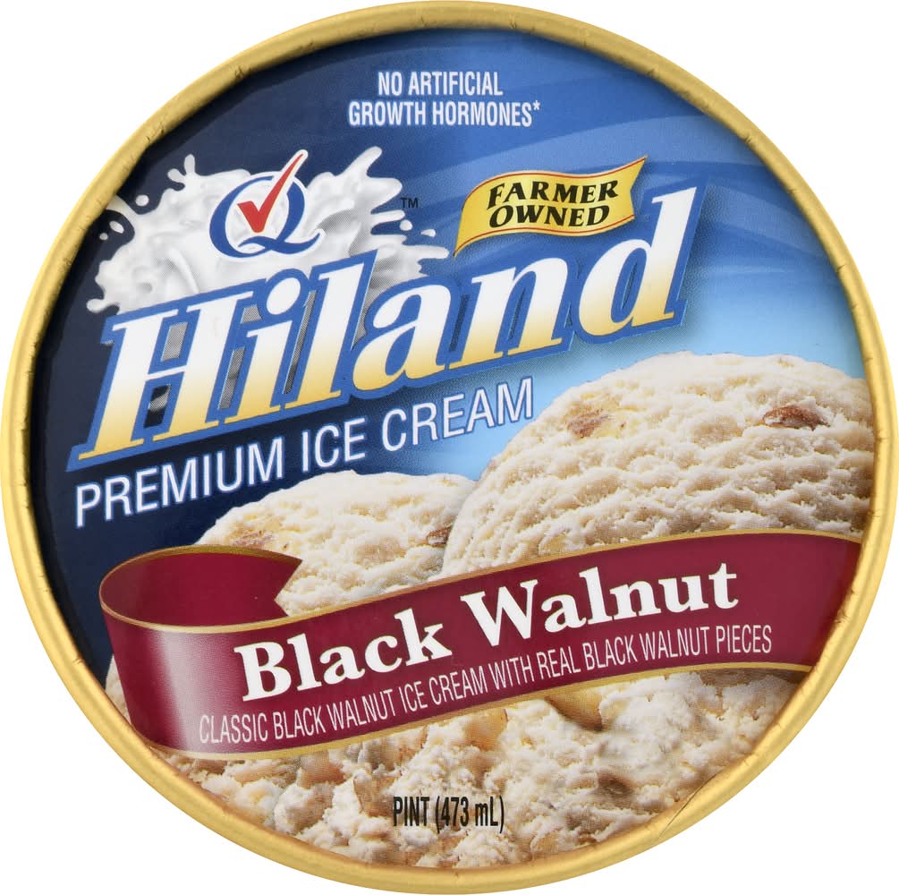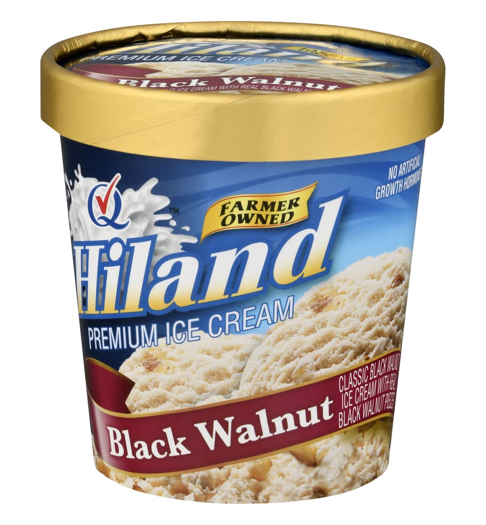 Classic black walnut ice cream with real black walnut pieces. No artificial growth hormones (The FDA state there is no difference in the quality or safety of milk with or without the use of rBST). www.hilanddairy.com. Farmer owned.