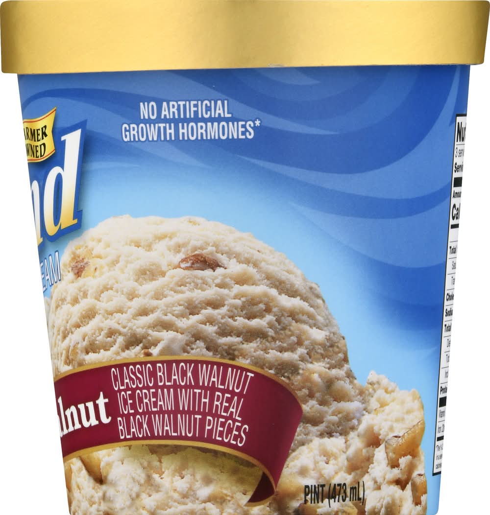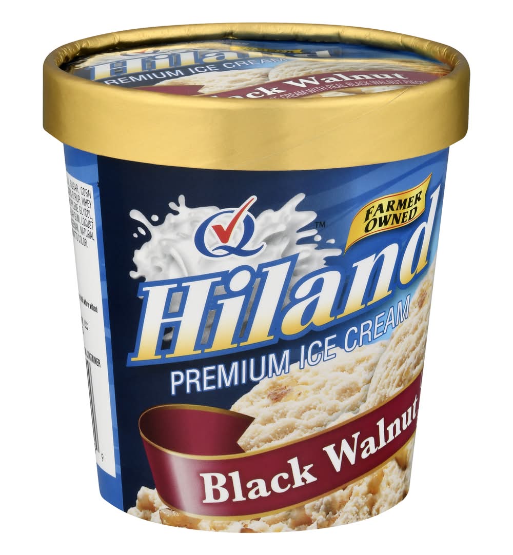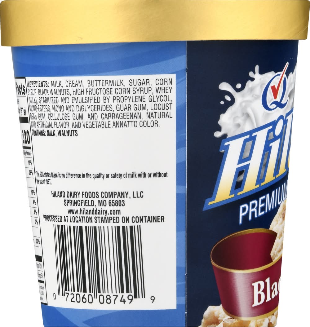 Classic black walnut ice cream with real black walnut pieces. No artificial growth hormones (The FDA state there is no difference in the quality or safety of milk with or without the use of rBST). www.hilanddairy.com. Farmer owned.