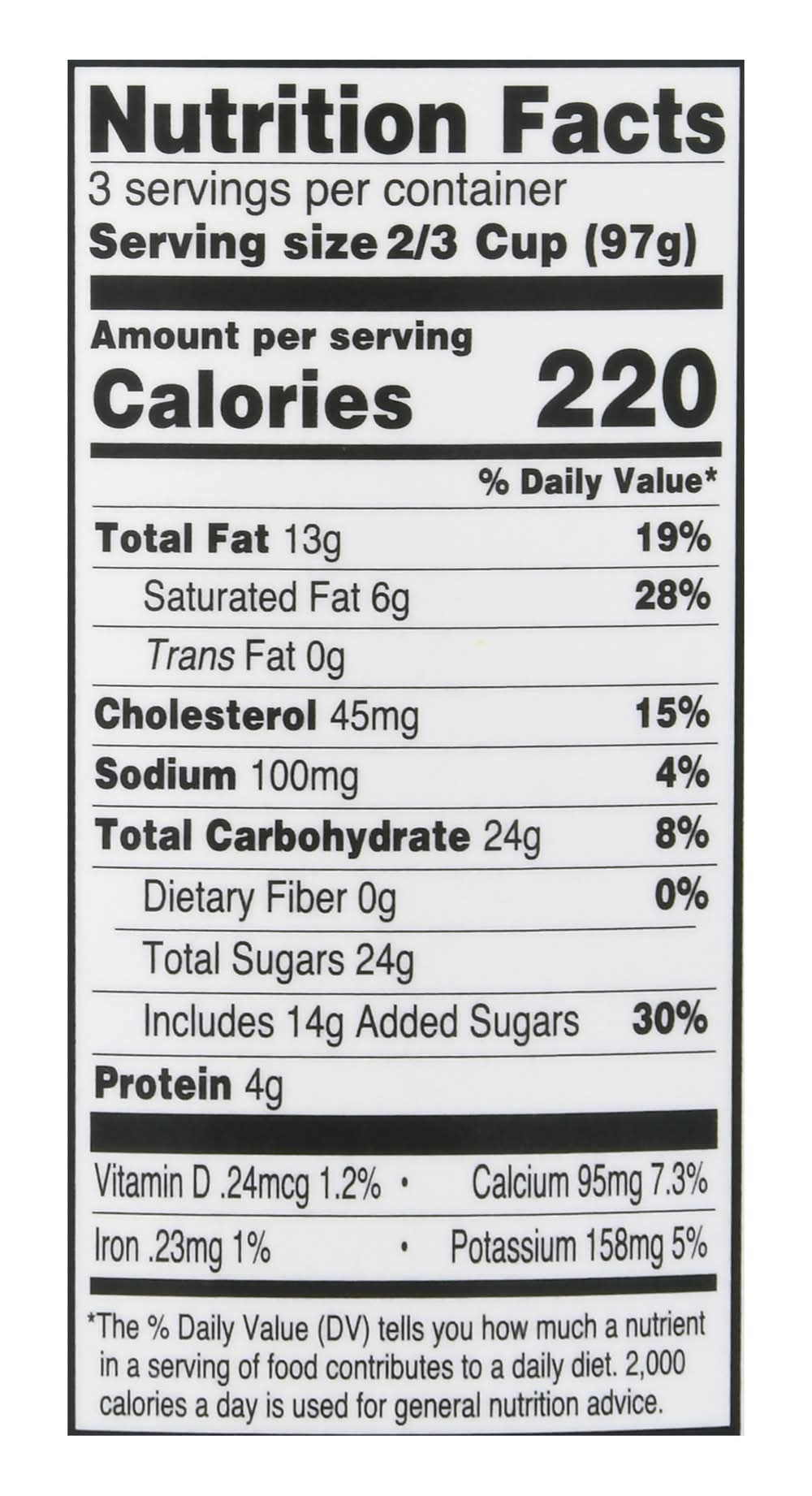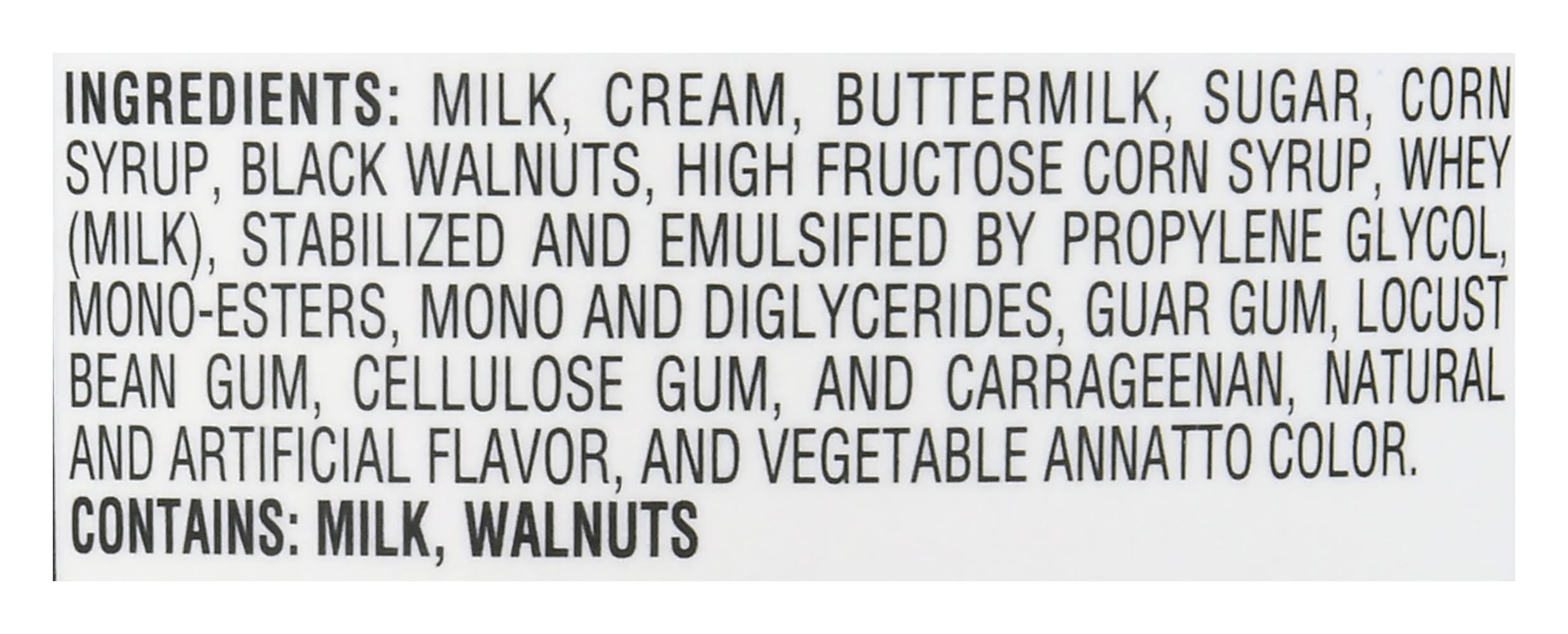 Ingredients: Milk, Cream, Buttermilk, Sugar, Corn Syrup, Black Walnuts, High Fructose Corn Syrup, Whey (Milk), Stabilized and Emulsified by Propylene Glycol, Mono-Esters, Mono and Diglycerides, Guar Gum, Locust Bean Gum, Cellulose Gum, and Carrageenan, Natural and Artificial Flavor, and Vegetable Annatto Color Contains: Milk, Tree Nuts