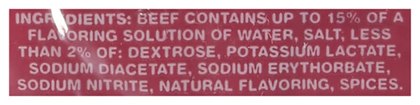 Ingredients: Beef Contains Up to 15% of a Flavoring Solution of Water, Salt, Less than 2% of: Dextrose, Potassium Lactate, Sodium Diacetate, Sodium Erythorbate, Sodium Nitrite, Natural Flavoring, Spices