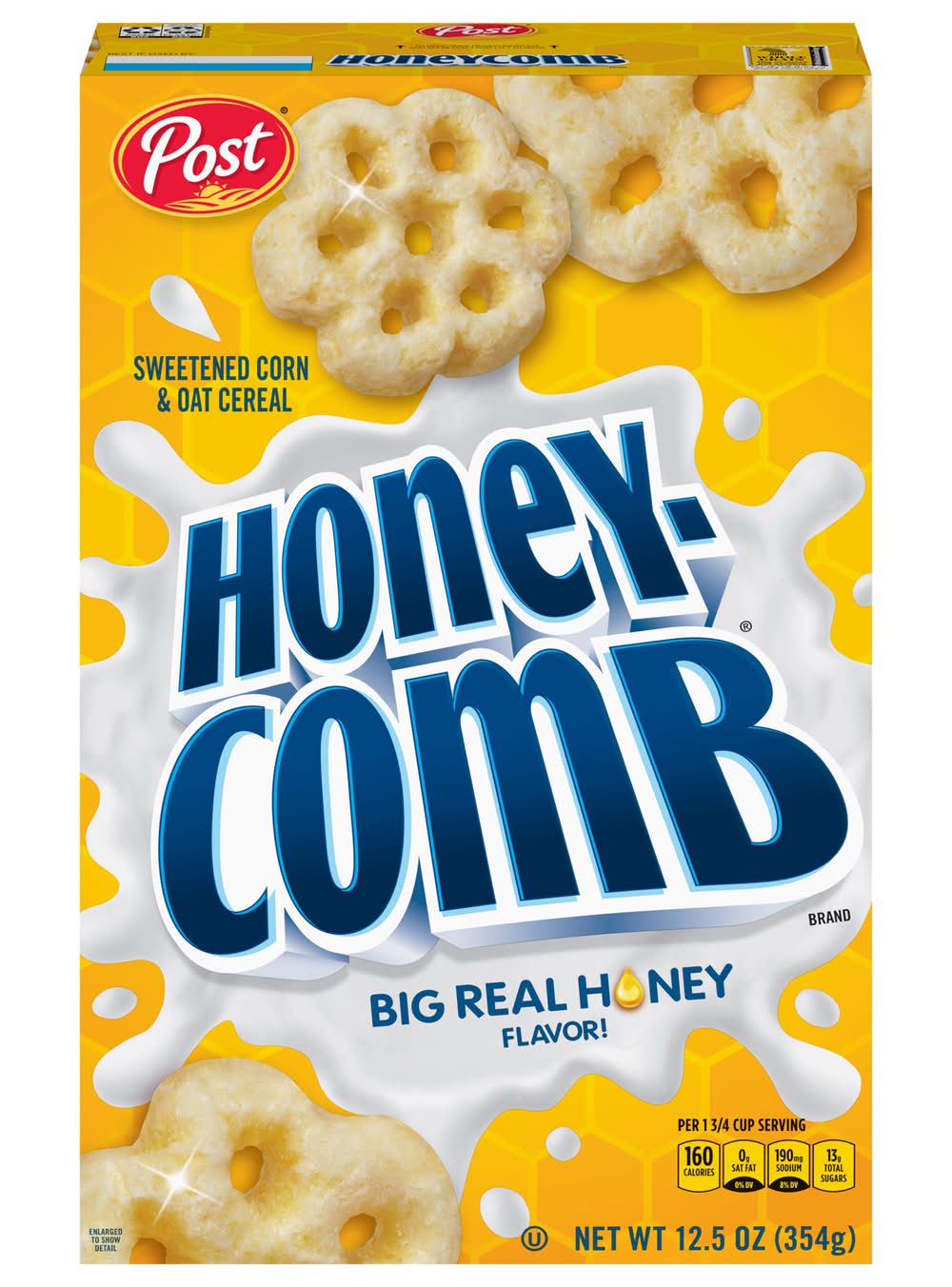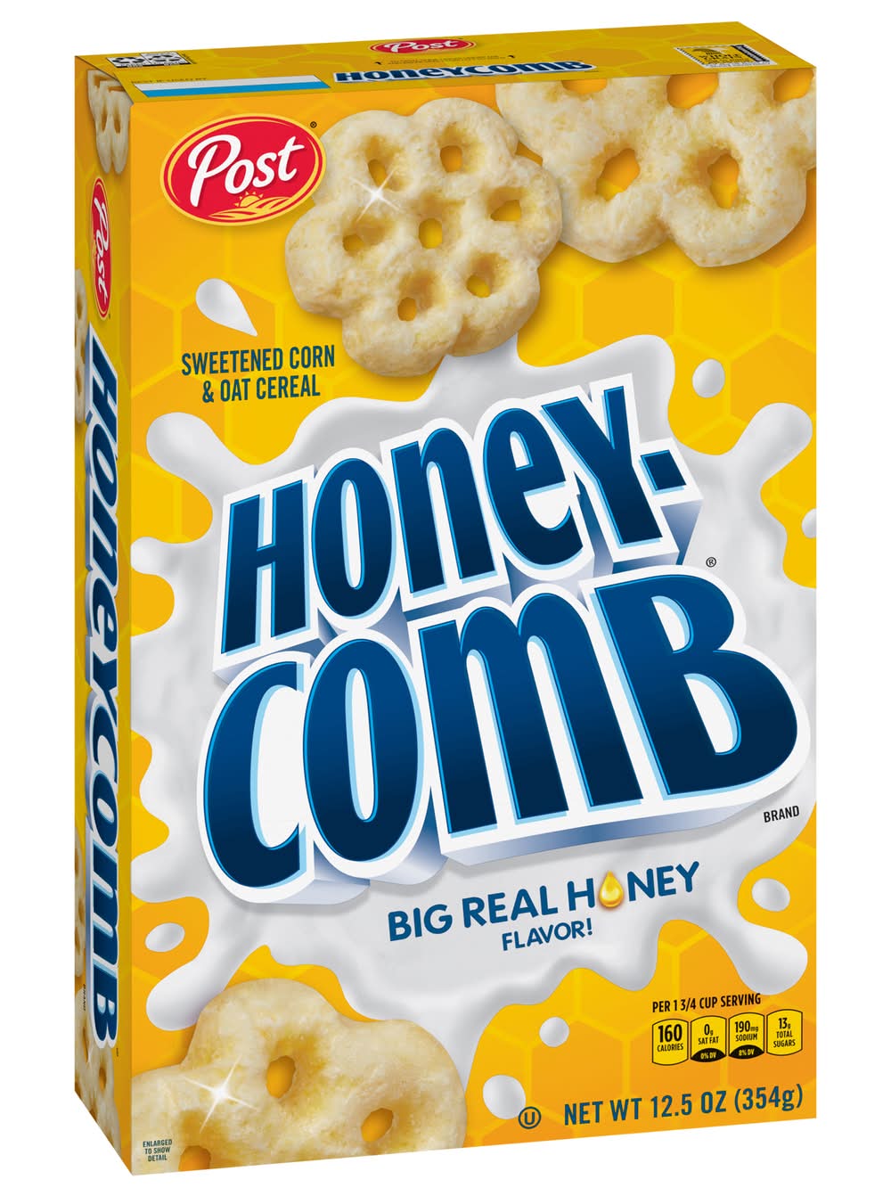 Post Honeycomb Cereal is a unique and playful breakfast cereal that lets you be you! Post Honeycomb Cereal features a unique shape and crunchy texture with a sweet honey flavor that makes it great in the bowl. This honey flavored corn and oat kids cereal is all the buzz and features real honey flavor with every crunchy bite. Fill your bowl with this honey cereal and milk for a delicious start to your day, or snack on it to enjoy the soft crunch and sweet flavor as an after school snack. Keep a box of Post Honeycomb Cereal on your pantry shelf for an easily snackable breakfast cereal that delivers big buzzing flavor no matter how you like to enjoy it. • Flavor: Honey • Packaging: Reusable