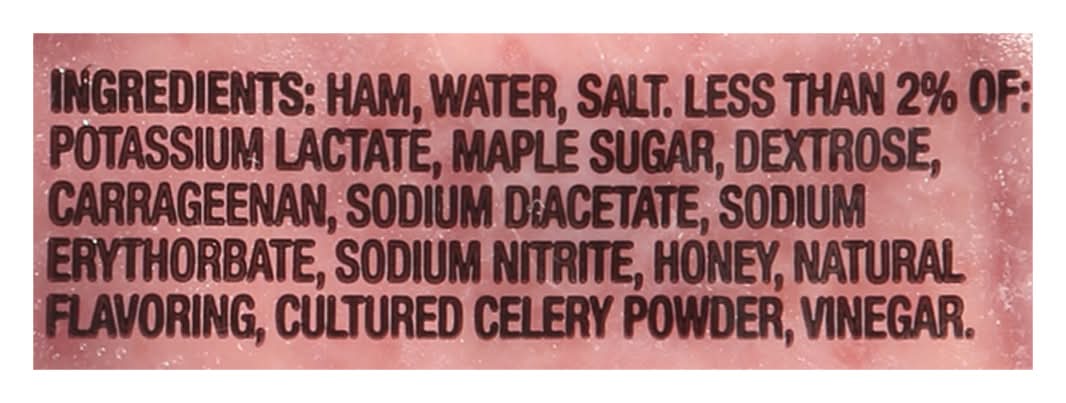Ingredients: Ham, Water, Salt, Less than 2% of: Potassium Lactate, Maple Sugar, Dextrose, Carrageenan, Sodium Diacetate, Sodium Erythorbate, Sodium Nitrite, Honey, Natural Flavoring, Cultured Celery Powder, Vinegar Contains: Celery