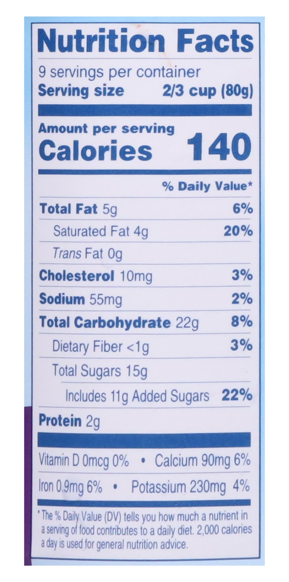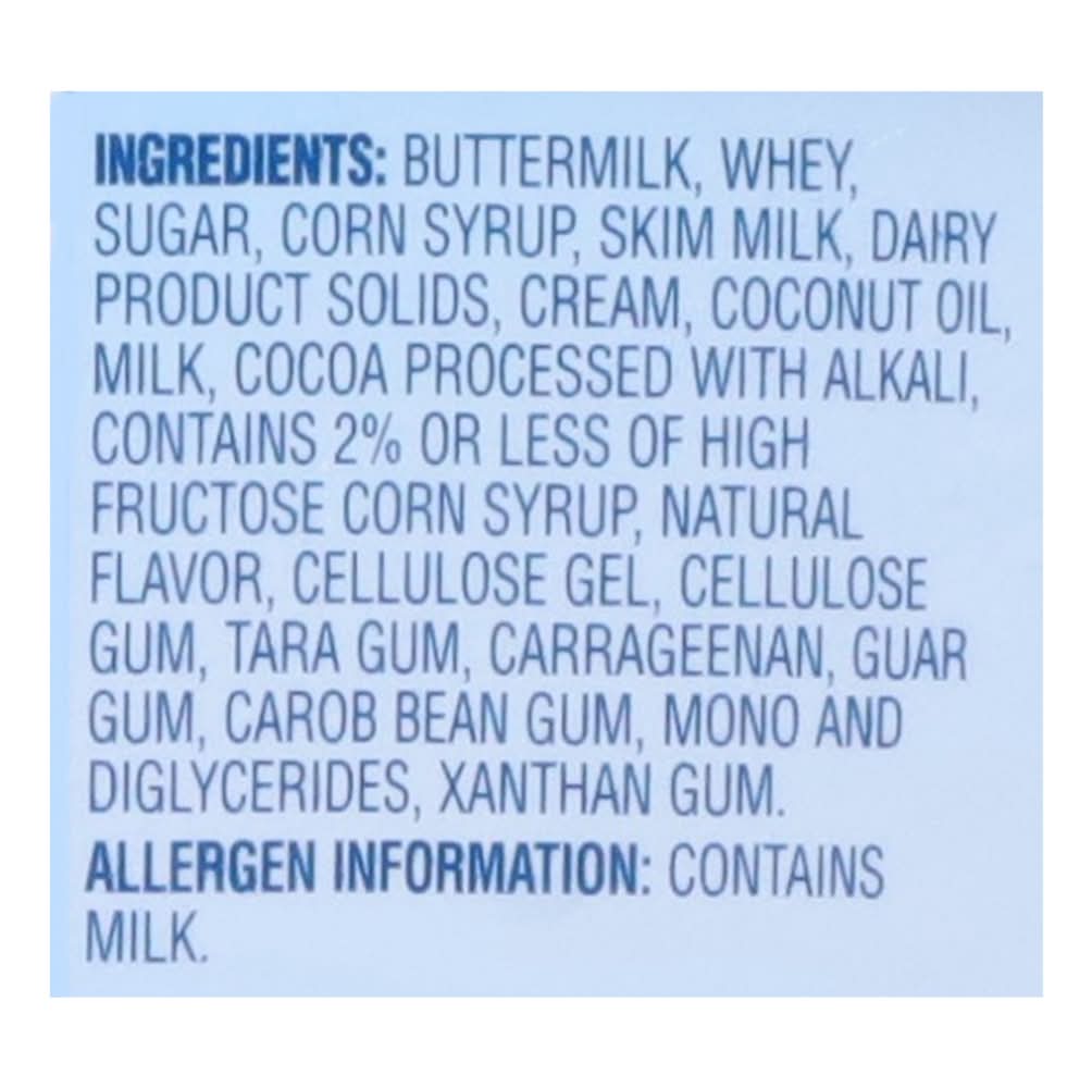 Ingredients: Buttermilk, Whey, Sugar, Corn Syrup, Skim Milk, Dairy Product Solids, Cream, Coconut Oil, Milk, Cocoa Processed with Alkali, Contains 2% or less of High Fructose Corn Syrup, Natural Flavor, Cellulose Gel, Cellulose Gum, Tara Gum, Carrageenan, Guar Gum, Carob Bean Gum, Mono and Diglycerides, Xanthan Gum. Contains: Contains Milk.