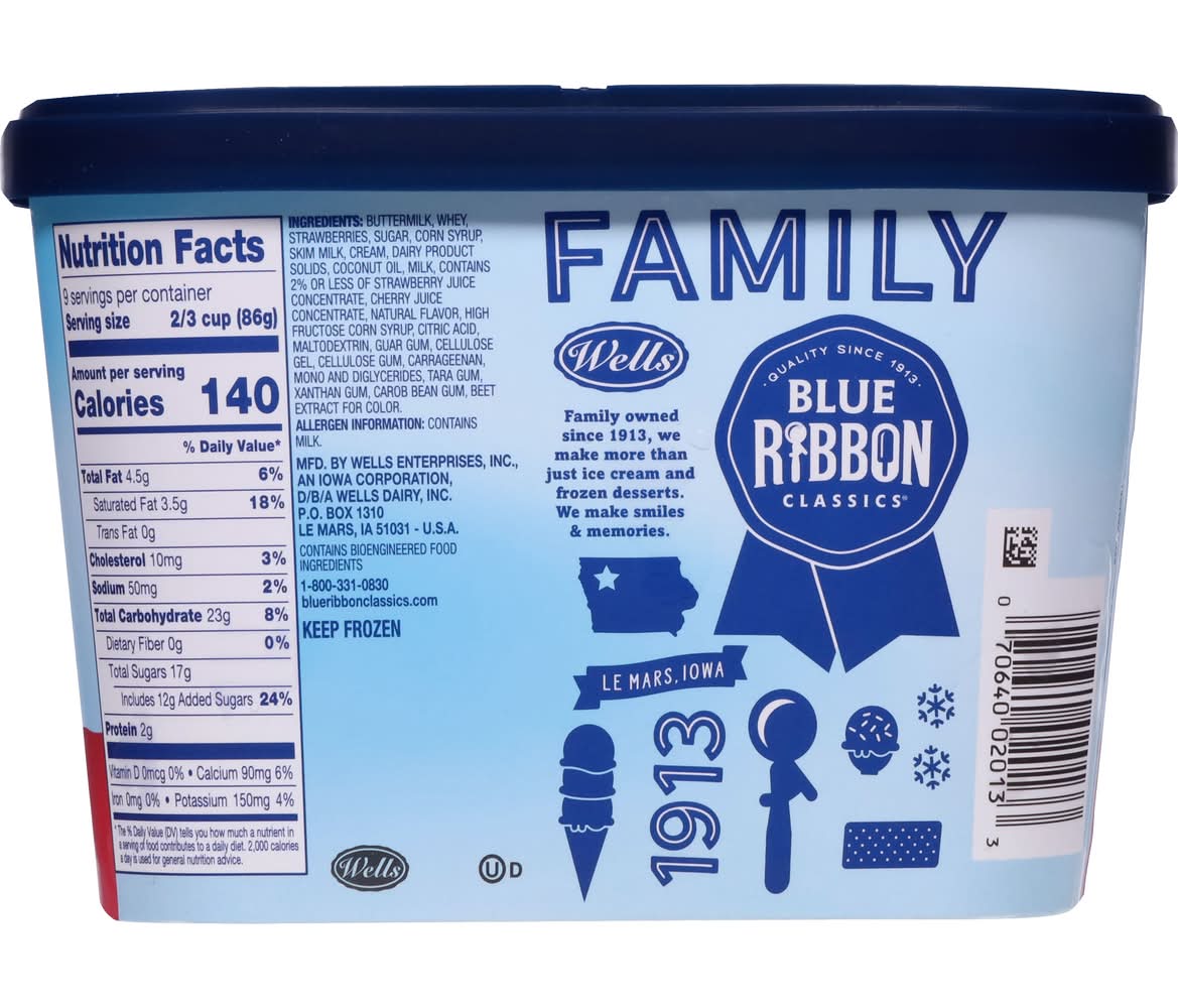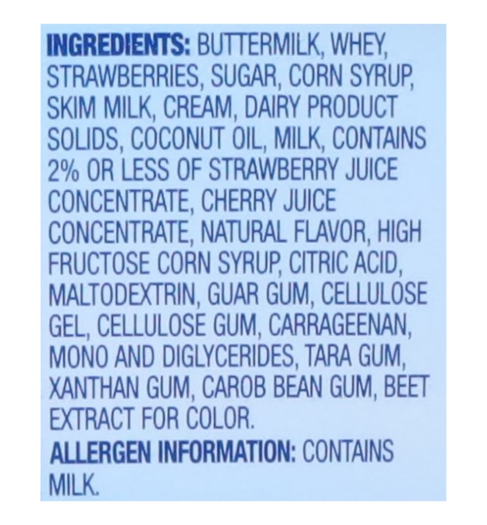 Ingredients: Buttermilk, Whey, Strawberries, Sugar, Corn Syrup, Skim Milk, Cream, Dairy Product Solids, Coconut Oil, Milk, Contains 2% or less of Strawberry Juice Concentrate, Cherry Juice Concentrate, Natural Flavor, High Fructose Corn Syrup, Citric Acid, Maltodextrin, Guar Gum, Cellulose Gel, Cellulose Gum, Carrageenan, Mono and Diglycerides, Tara Gum, Xanthan Gum, Carob Bean Gum, Beet Extract for Color. Contains: Contains Milk.