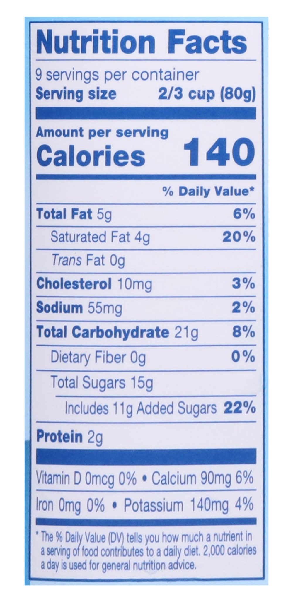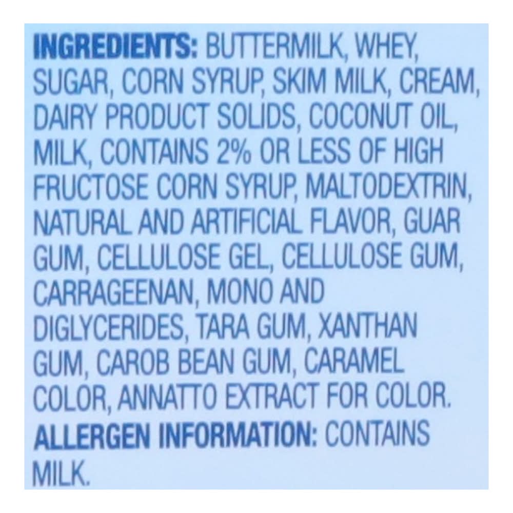 Ingredients: Buttermilk, Whey, Sugar, Corn Syrup, Skim Milk, Cream, Dairy Product Solids, Coconut Oil, Milk, Contains 2% or less of High Fructose Corn Syrup, Maltodextrin, Natural and Artificial Flavor, Guar Gum, Cellulose Gel, Cellulose Gum, Carrageenan, Mono and Diglycerides, Tara Gum, Xanthan Gum, Carob Bean Gum, Caramel Color, Annatto Extract for Color. Contains: Milk