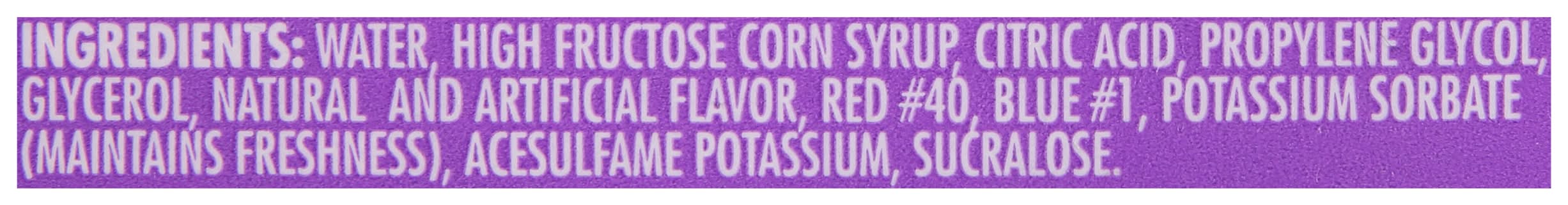 Ingredients: Water, High Fructose Corn Syrup Citric Acid, Propylene Glycol, Glycerol, Natural and Artificial Flavor, Red 40, Blue 1, Potassium Sorbate (Maintains Freshness), Acesulfame Potassium, Sucralose