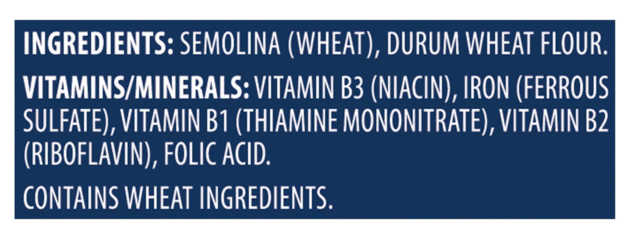 Ingredients: Semolina (Wheat), Durum Wheat Flour. Vitamins/Minerals: Vitamin B3 (Niacin), Iron (Ferrous Sulfate), Vitamin B1 (Thiamine Mononitrate), Vitamin B2 (Riboflavin), Folic Acid Contains: Wheat