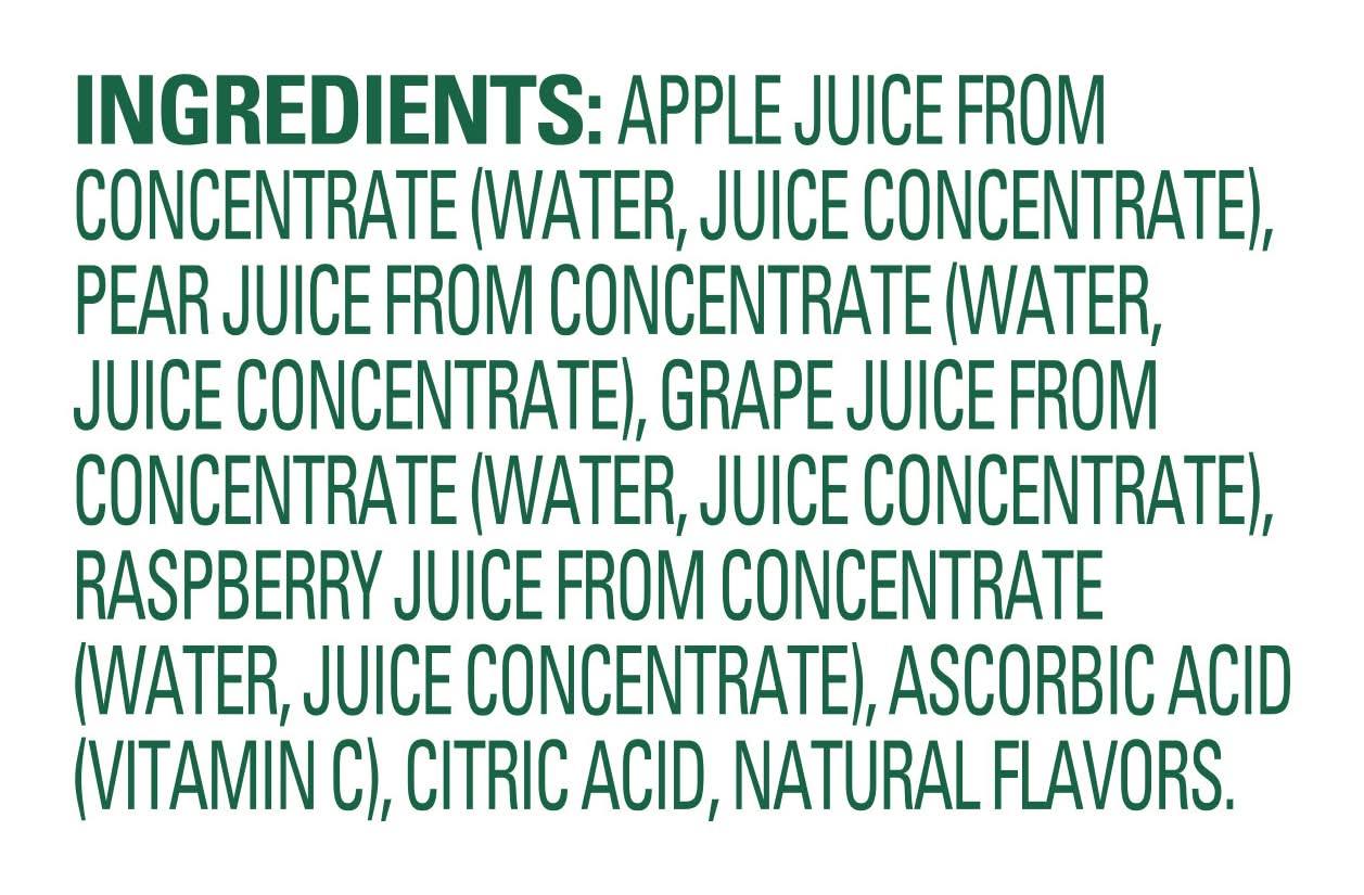 Ingredients: Apple Juice From Concentrate (Water, Juice Concentrate) Pear Juice From Concentrate (Water, Juice Concentrate), Grape Juice From Concentrate (Water, Juice Concentrate, Raspberry Juice From Concentrate (Water, Juice Concentrate), Ascorbic Acid (Vitamin C), Citric Acid, Natural Flavors.
