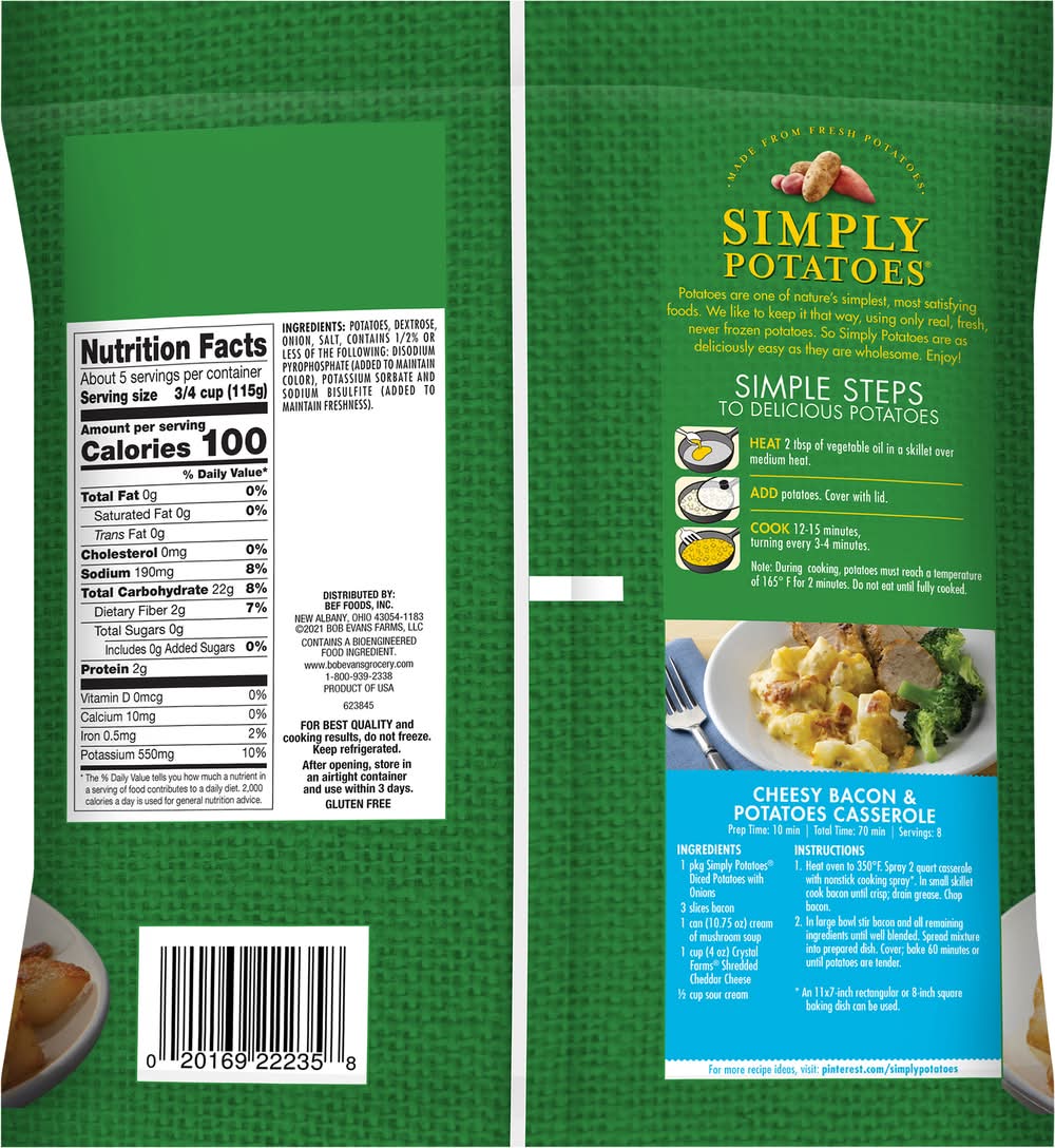 Contains a bioengineered food ingredient. Cook before serving. Potatoes are one of nature's simplest, most satisfying foods. We like to keep it that way, using only real, fresh, never frozen potatoes. So Simply Potatoes are as deliciously easy as they are wholesome. New Albany, Ohio,43054-1183