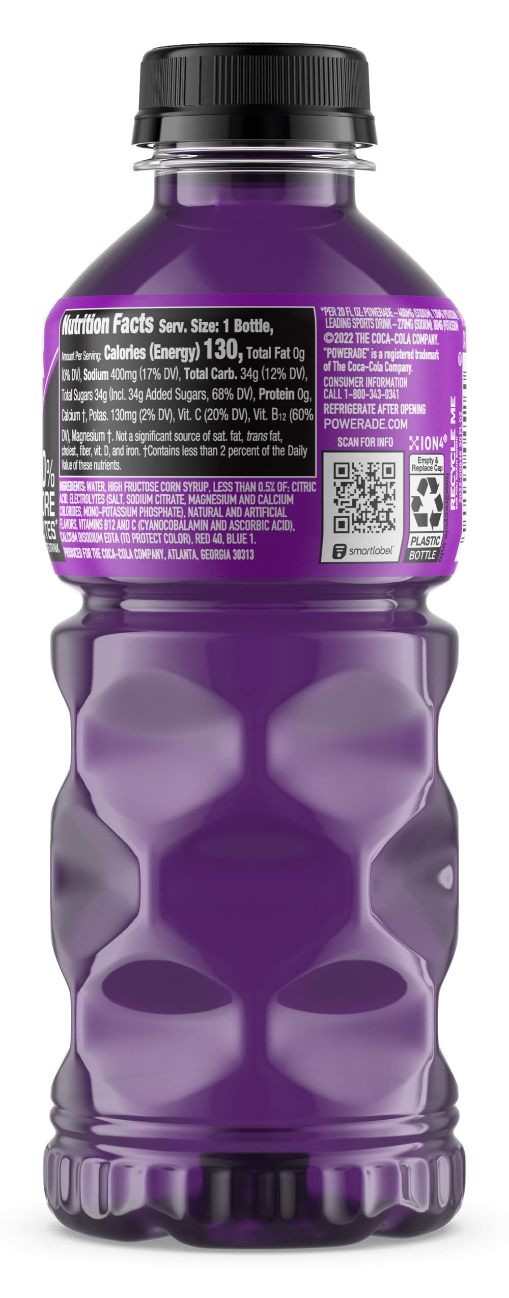 50% more electrolytes (per 20 fl oz Powerade - 400 mg (sodium). 130 mg (potassium); leading sport drink - 270 mg (sodium), 80 mg potassium)) + Vitamin C + Vitamin B12. • Flavor: Grape • Packaging: Reusable