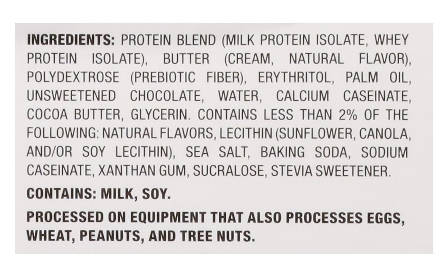Ingredients: Protein Blend (Milk Protein Isolate, Whey Protein Isolate), Butter (Cream, Natural Flavor), Polydextrose (Prebiotic Fiber), Erythritol, Palm Oil, Unsweetened Chocolate, Water, Calcium Caseinate, Cocoa Butter, Glycerin, Contains Less than 2% of the Following: Natural Flavors, Lecithin (Sunflower, Canola, and/or Soy Lecithin), Sea Salt, Baking Soda, Sodium Caseinate, Xanthan Gum, Sucralose, Stevia Sweetener Contains: Milk, Soybeans, Eggs, Wheat, Peanuts, Tree Nuts
