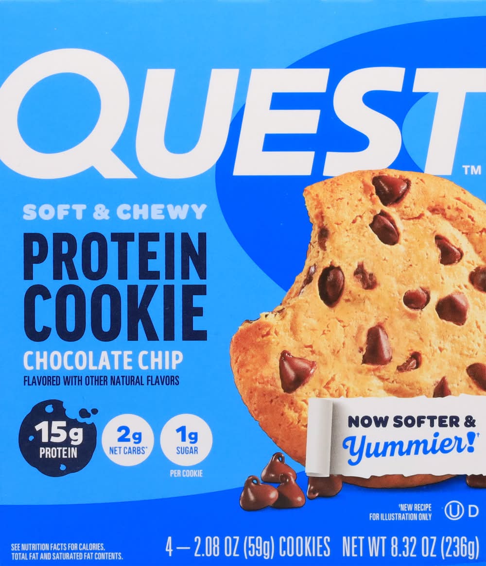 A soft & chewy chocolate chip cookie loaded with chocolate chips with 15g of protein and less than 1g of sugar. • Flavor: Chocolate chip • Quest Nutrition, Llc, El Segundo,CA,90245