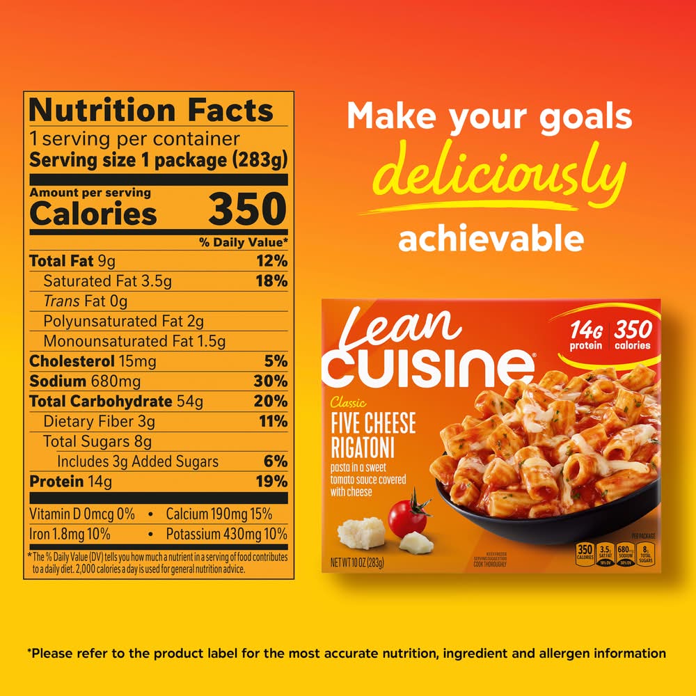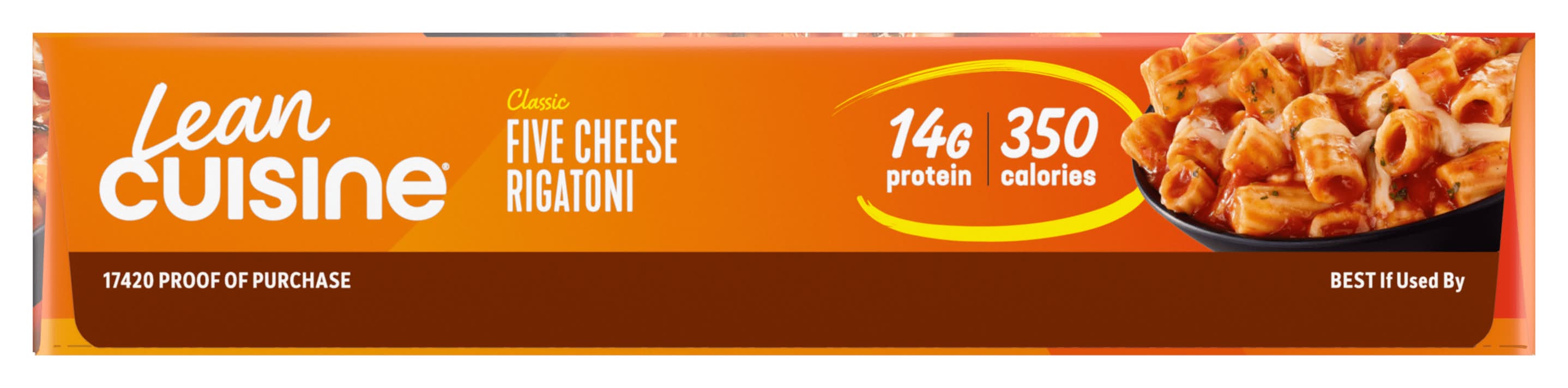 It is a quick, satisfying option for busy weeknights or effortless lunches. This meal features rigatoni pasta that is made fresh daily, in a sweet tomato sauce, topped with cheese for real comfort you can feel good about. Whenever you’re searching for perfectly portioned meals that fit into your routine, think of Lean Cuisine. Whether you're stocking up on convenient frozen dinners or looking for food that fits your meal plan goals, Lean Cuisine makes it easy to stay on track. Our rigatoni frozen single meals have 14g of protein, making them great meals you can count on to help hit your macros. Simply microwave and enjoy — no prep, no cleanup, just smart eating made simple. Packaging: Reusable