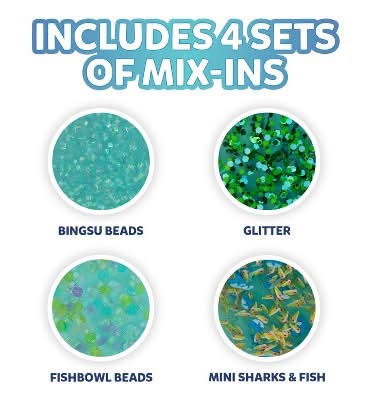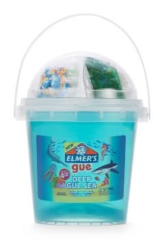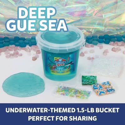Elmers Deep Gue Sea Slime Bucket is a premade, clear blue slime that is scented and comes ready for immediate play, requiring no additional glue or activators. This nontoxic slime is specifically designed for entertainment, ideal for activities such as parties and after-school fun. It includes a variety of ocean-themed mix-ins, such as Fishbowl Beads and Mini Sharks and Fish, which enhance creative play. While engaging with this product, it is advised not to consume it.