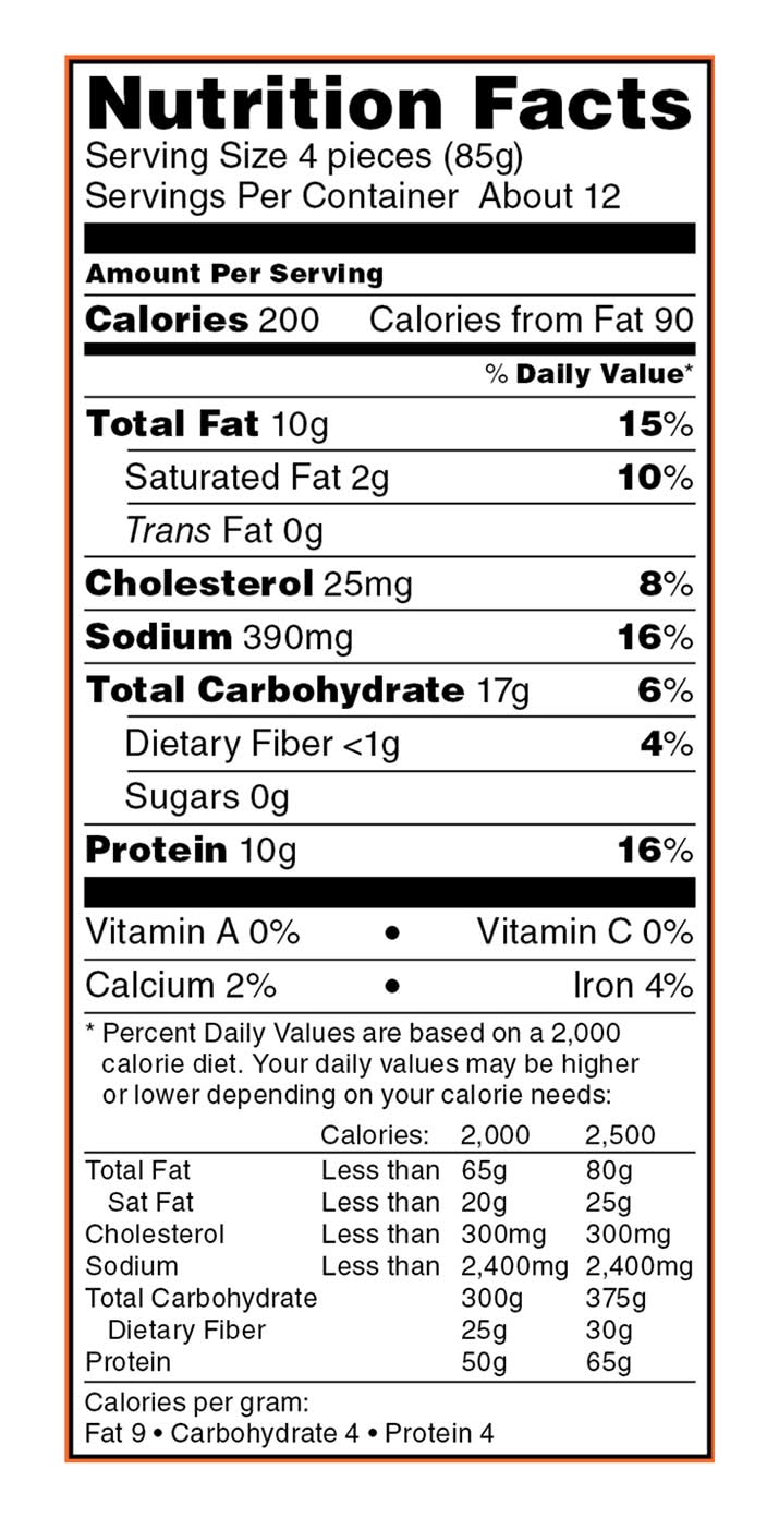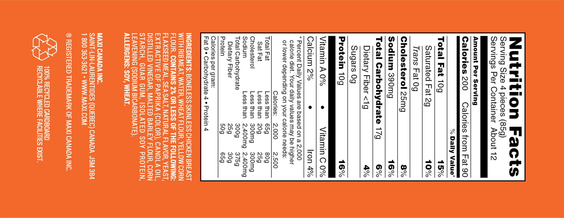 Ingredients: Boneless Skinless Chicken Breast with Rib Meat, Water, Wheat Flour, Yellow Corn Flour, Contains 2% or Less of the Following: Flaxseed Meal, Sea Salt, Natural Flavor, Yeast, Extractive of Paprika (Color), Canola Oil, Distilled Vinegar, Malted Barley Flour, Corn Starch, Guar Gum, Isolated Soy Protein, Leavening (Sodium Bicarbonate) Contains: Soybeans, Wheat, Corn, Barley