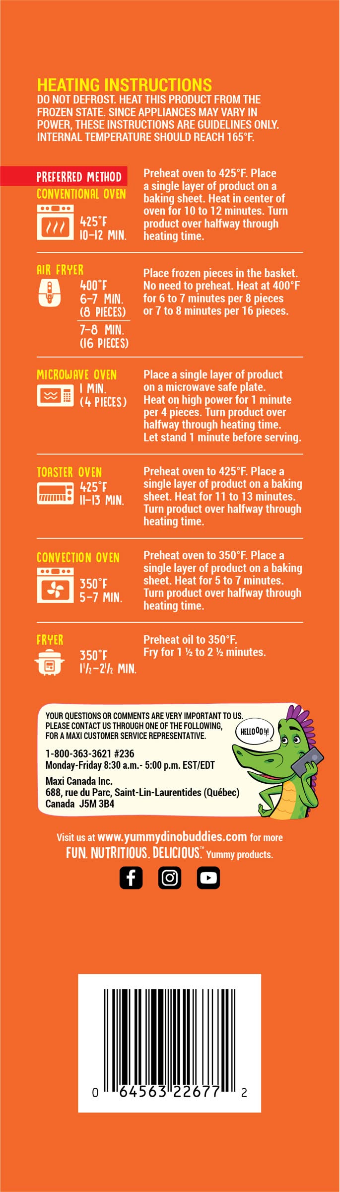 Crafted from chicken breast patty fritters with rib meat, offering a source of protein with 10 grams per serving. They are free from artificial flavors, colors, and preservatives, and contain no artificial ingredients. Each serving provides 650 mg of omega-3 fatty acids from canola oil and flax. The chicken used is raised without the use of antibiotics. These dinosaur-shaped chicken nuggets come fully cooked and are packaged in a resealable bag for convenience. • Number of servings: 13 • Packaging: Reusable