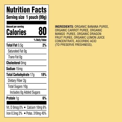 Give your little one a tasty new snack option that's full of fruits and veggies with this Organic Banana Carrot Mango Baby Food Pouch from Good & Gather™. Made with organic bananas, carrots, mango and dragon fruit, this snack pouch contains 45% of the recommended daily value of potassium and features no artificial colors or artificial flavors. This food pouch is recommended for ages 6 months and up — around the time they start sitting without support and clearing food from the spoon with their lips. Every product that carries the Good & Gather™ name starts with quality ingredients that deliver great taste, making it easier for you and your family to eat well every day. We promise you’ll love each bite or your money back.