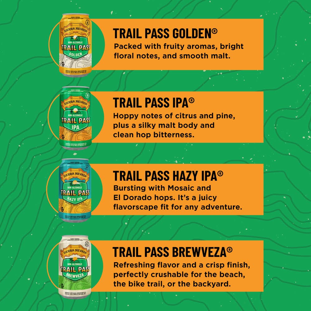 Not the right time for a beer, but got a hop craving? Dive into full craft flavor with Sierra Nevada's line of non-alcoholic craft brews with the brand new Trail Pass Non-Alc Variety Pack. Crafted with the same dedication to quality and innovation that Sierra Nevada is known for, the Trail Pass Non-Alcoholic Variety Pack offers something for everyone, whether you're hitting the trails or simply unwinding after a long day. So grab a pack, gather your friends, and toast to the endless possibilities of flavor, without the alcohol. Pack size: 12