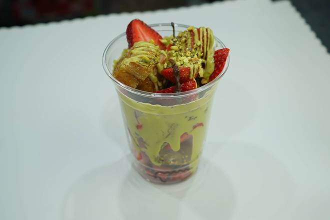 Experience the delightful layers of Strawberry and Pistachio Baklava in a cup, taken to new heights by The Baklava Box!