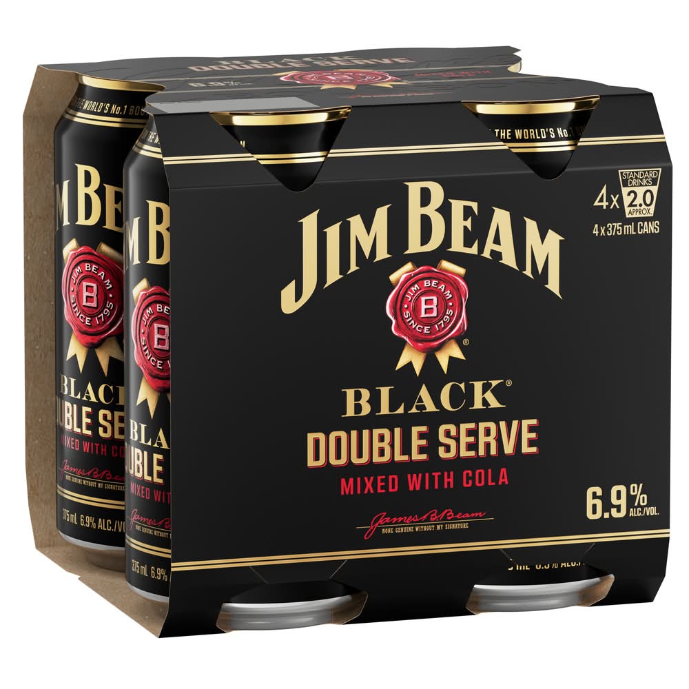 Ready to drink cans have never tasted better than this Jim Beam Double Black Serve. With a double serve of Jim Beam Kentucky Straight Bourbon Whiskey perfectly blended with cola, this is a smooth, flavourful classic. • Brand: Jim beam • Pack size: 4 • Alcohol by volume: 6.9%