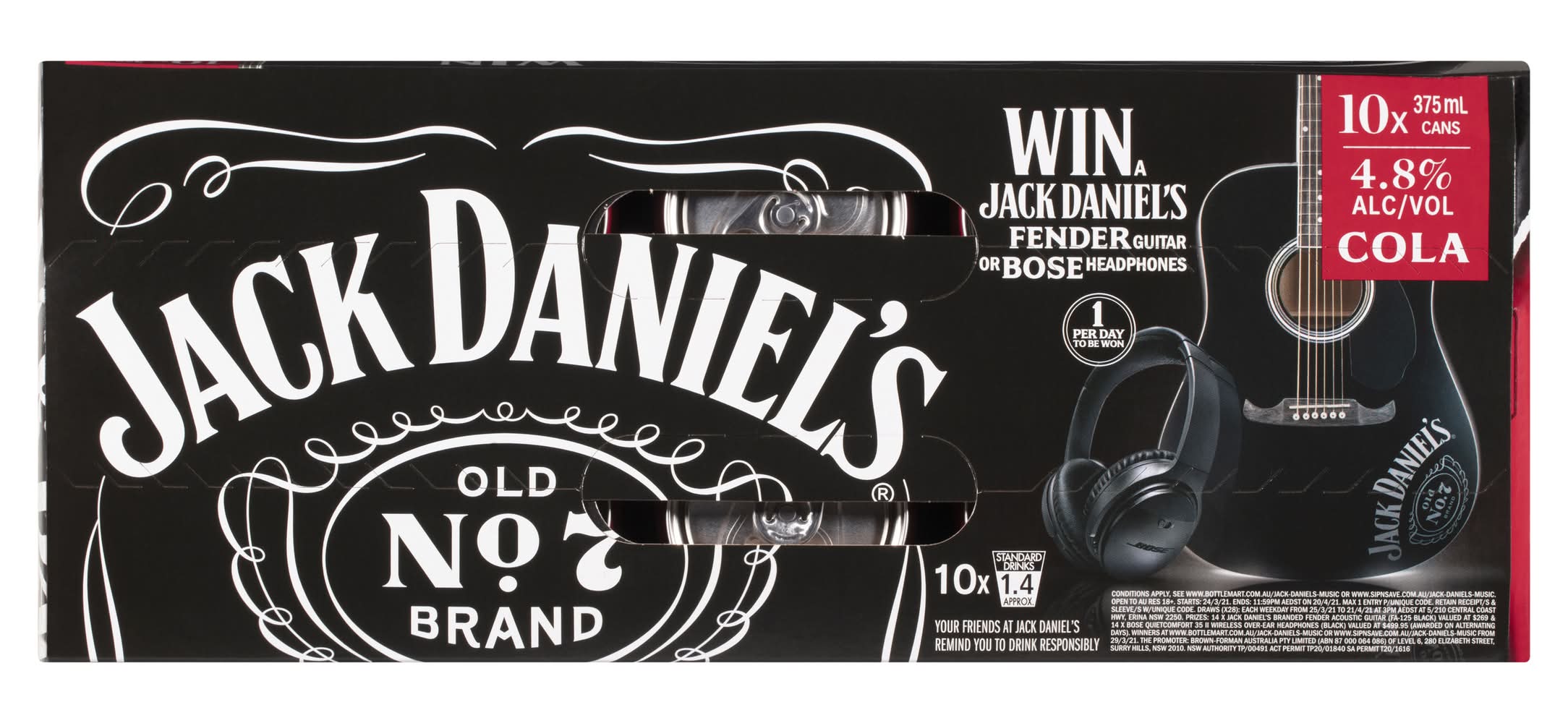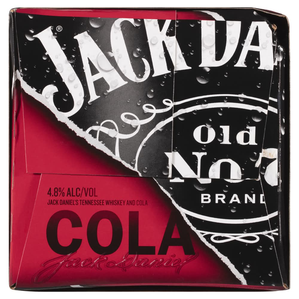 Jack Daniel's Tennessee Whiskey and Cola delivers a ready to drink whiskey cocktail that features one of the world's best selling whiskies with a twist. Perfectly pre-mixed, this canned drink combines Jack Daniel's Old No. 7 with fizzy cola for a refreshingly all-time classic mixed drink. You can enjoy the convenient format of these Jack and Cola whiskey cocktails on the go, straight from the fridge, or right out of the cooler. Simply serve it cold straight from the can or over ice, and always in good company. Add these Jack and Cola canned cocktails to your cooler alongside beer and hard seltzer. If you want a whiskey cocktail ready to go, Jack Daniel’s has you covered. Jack Daniel's Tennessee Whiskey and Cola is real Jack that's ready to go whenever you are. Live Freely. Drink Responsibly. • Brand: Jack daniel's • Pack size: 10 • Alcohol by volume: 4.8%