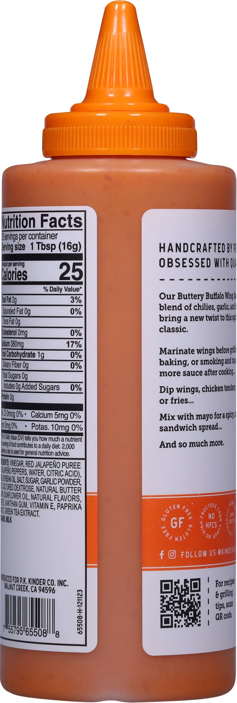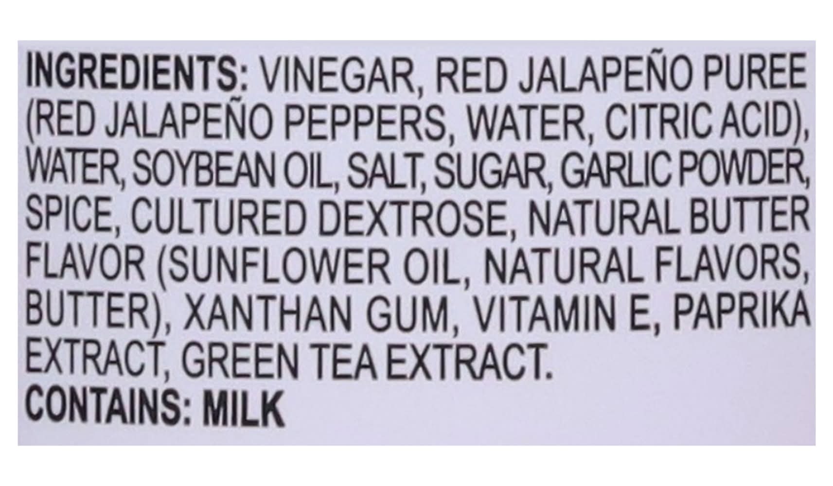 Ingredients: Vinegar, Red Jalapeno Puree (Red Jalapeno Peppers, Water, Citric Acid), Water, Soybean Oil, Salt, Sugar, Garlic Powder, Spice, Cultured Dextrose, Natural Butter Flavor (Sunflower Oil, Natural Flavors, Butter), Xanthan Gum, Vitamin E, Paprika Extract, Green Tea Extract Contains: Milk, Soybeans