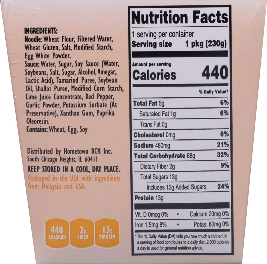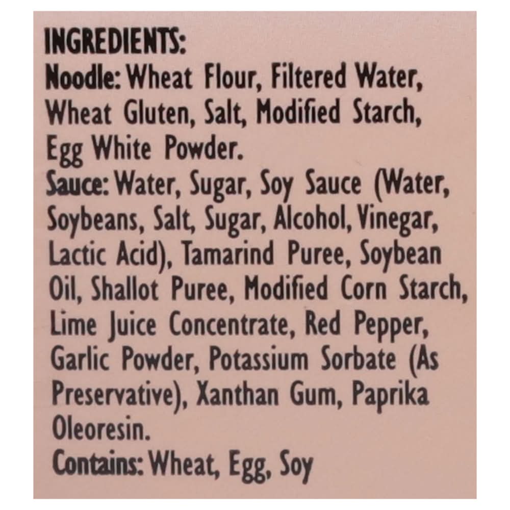 Ingredients: Noodle: Wheat Flour, Filtered Water, Wheat Gluten, Salt, Modified Starch, Egg White Powder, Sauce: Water, Sugar, Soy Sauce (Water, Soybeans, Salt, Sugar, Alcohol, Vinegar, Lactic Acid), Tamarind Puree, Soybean Oil, Shallot Puree, Modified Corn Starch, Lime Juice Concentrate, Red Pepper, Garlic Powder, Potassium Sorbate (as Preservative), Xanthan Gum, Paprika Oleoresin Contains: Wheat, Eggs, Soybeans