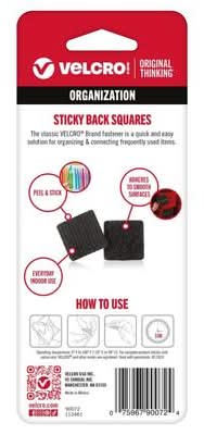 VELCRO USA's classic hook and loop fasteners in convenient pre-cut squares. Features general purpose adhesive for smooth surface applications. Fast and easy, no tools or hardware required. Simple peel and stick application. Great for hanging signs, posters and small objects.VELCRO Brand Sticky Back fasteners are ideal for smooth surfaces and can be used indoors. They are available in squares, coins, strips, and tapes and come in a range of colors. Color: Black
