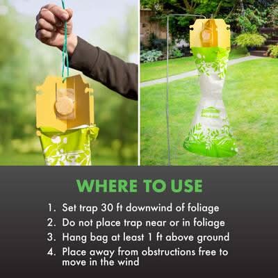 Stop - read entire label before use. directions for use: it is a violation of federal law to use this product in a manner inconsistent with its labeling. 1. slide the vanes together so slots interlock. 2. lure attachment: peel the cover from the dual lure system. mount the opened lure between the yellow vanes by inserting the notched corners through the vane assembly slots as shown in fig 1. make sure that the exposed side is facing inward and snap into place. bend the tab on top slightly inward for protection from the rain. 3. bag attachment: attach one of the disposable trap bags onto the yellow vane assembly as shown in fig 2. gently push a small slit on the open end of the bag over each of the hooks on the vanes. be careful not to tear or stretch the slits. drop a few small pebbles into the bag to stabilize the trap. 4. hanger attachment: insert about 3 inches of the trap hanger tie through the two holes in the top of the vane assembly. twist the tie to secure the trap. for use with the spectracide bag-a-bug kwikstand (sold separately), insert the stand's hanger through one of the holes at the top of the vane as shown in fig. 3. 5. trap placement: to be most effective, the trap should be located about 30 ft downwind of foliage to intercept beetles heading toward it. do not place tap near or in the foliage, as it will attract more beetles into it (see fig 4). hang the trap on a kwikstand or any convenient post or stake. the bottom of the bag should be at least a foot above the ground, and the trap free to move in the wind without hitting any obstructions (see fig 5). hang the trap where it is inaccessible to small children. 6. periodically check trap: the majority of beetles will be caught during their highest flight activity period. this is normally on sunny days with temperatures between 70 and 95 degrees f and from about 10:00 a.m. to 3:30 p.m. check bag occasionally. replace it when the lower portion is full of beetles. change the bags every four to five days to avoid repelling beetles due to odor of dead beetles. inspect bag after rainstorms. if the drain holes along the bottom of the bag become clogged, gently clear them using a toothpick or pencil point or replace bag. note: remove trap to a protected area during heavy rain or wind. 7. seal bag when full: seal filled bags by knotting the top funnel portion. normally, trapped beetles die after several hours in the heat and sun. leaving sealed bags in sun for a while can kill live beetles. important: make sure beetles are dead before disposal. see following section on disposal of bags. 8. lure replacement: for maximum effectiveness, begin trap use as early in the season as possible. sexual activity of the japanese beetle is greater in june in southern states and july in northern states. under normal conditions, the combination lure is effective for about 12 weeks. replace it after this period or when its floral aroma is no longer noticeable. premature ineffectiveness of the lure may be due to a repellant odor from dead beetles. see step 6 and follow section on disposal of lures. 9. problems that may occur: a) lure no longer attracts beetles: few beetles in area; repellent effect of dead beetles: see step 6; dual lure is unopened or uninstalled. b) beetles eating foliage/flowers after setting trap. remove trap from immediate vicinity of foliage. see step 5. c) beetles escaping through bags. animal damage. bags are often attacked and damaged at night by nocturnal animals (skunks, cats, etc.). replace damaged bag. bring trap inside each night to prevent future damage. replacement bags and lures are available. storage and disposal: storage: do not contaminate water, food or feed by storage or disposal. store in a cool dry place. do not open until ready to use. disposal: if empty: do not reuse this container. place in trash or offer for recycling if available. if partly filled: call your local solid waste agency for disposal instructions. never place unused product down any indoor or outdoor drain. number of traps needed: for maximum effectiveness, use the suggested number of traps. area covered: less than 1/8 acre: suggested no. of traps: 1. area covered: 1/8 to 1/4 acre: suggested no. of traps: 2. area covered: 1/4 to 1/2 acre: suggested no. of traps: 3. area covered: 1/2 acre: suggested no. of traps: 4. area covered: over 1/2 acre: suggested no. of traps: use one trap every 150 to 200 ft along perimeter.