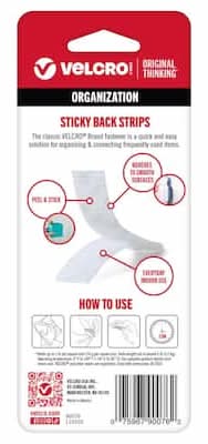 VELCRO Brand Sticky Back hook and loop fasteners deliver strong holding power. Simple peel and stick application. For smooth surfaces such as painted wallboard, glass, metal and most plastics, can be used for indoor or outdoor applications. VELCRO Brand is the original hook and loop fastener. Much better durability and strength than other off brand fasteners. They are available in squares, coins, strips, and tapes and come in a range of different sizes and colors. A must have for any home, school or office. Great for organization, mounting, hanging, and securing. Instructions:1. Clean and dry surface before application.2. Peel tape from fastener and press firmly into place.3. Adhesive reaches maximum strength after 24 hours. Note: Not recommended for fabrics, flexible vinyl or underwater use. Continued exposure to full sunlight can damage fastener. Size: 3.5" x 0.75"