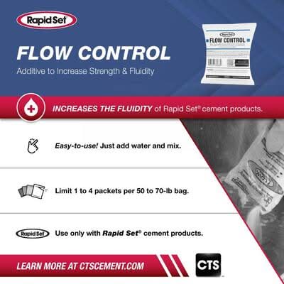 Rapid Set FLOW Control has 2 functions. First, adding FLOW Control to your mix will significantly increase the fluidity of the mixture. Second, FLOW Control increases the strength and reduces the shrinkage of your mixture when you use the FLOW Control as a replacement for mixing water. When using FLOW Control, the same working consistency (or slump) may be produced with approximately 20% to 40% less mixing water. Use enough FLOW Control to achieve desir Cancer and Reproductive Harm - www.P65Warnings.ca.gov