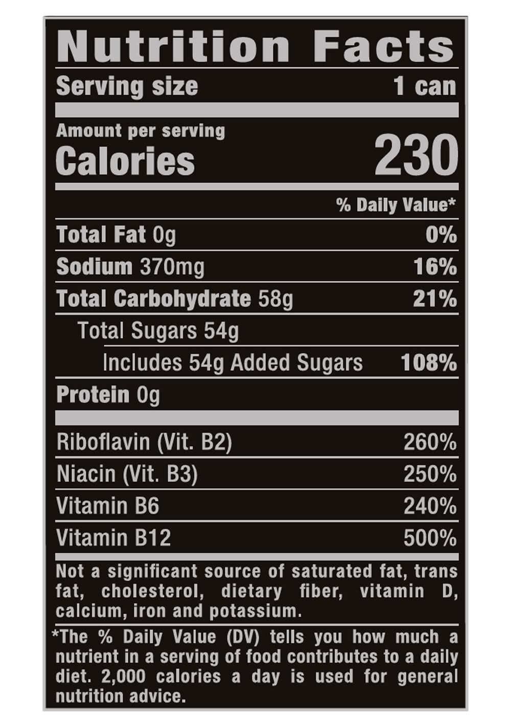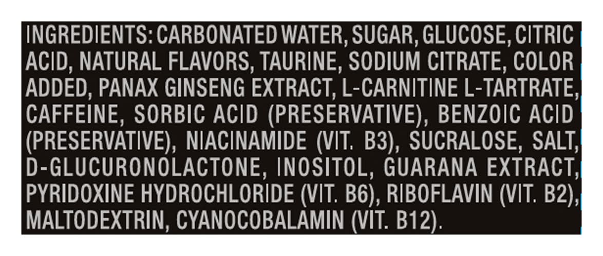 Ingredients: Carbonated Water, Sugar, Glucose, Citric Acid, Natural Flavors, Taurine, Sodium Citrate, Color Added, Panax Ginseng Extract, L-Carnitine L-Tartrate, Caffeine, Sorbic Acid (Preservative), Benzoic Acid (Preservative), Niacinamide (Vit. B3), Sucralose, Salt, D-Glucuronolactone, Inositol, Guarana Extract, Pyridoxine Hydrochloride (Vit. B6), Riboflavin (Vit. B2), Maltodextrin, Cyanocobalamin (Vit. B12)