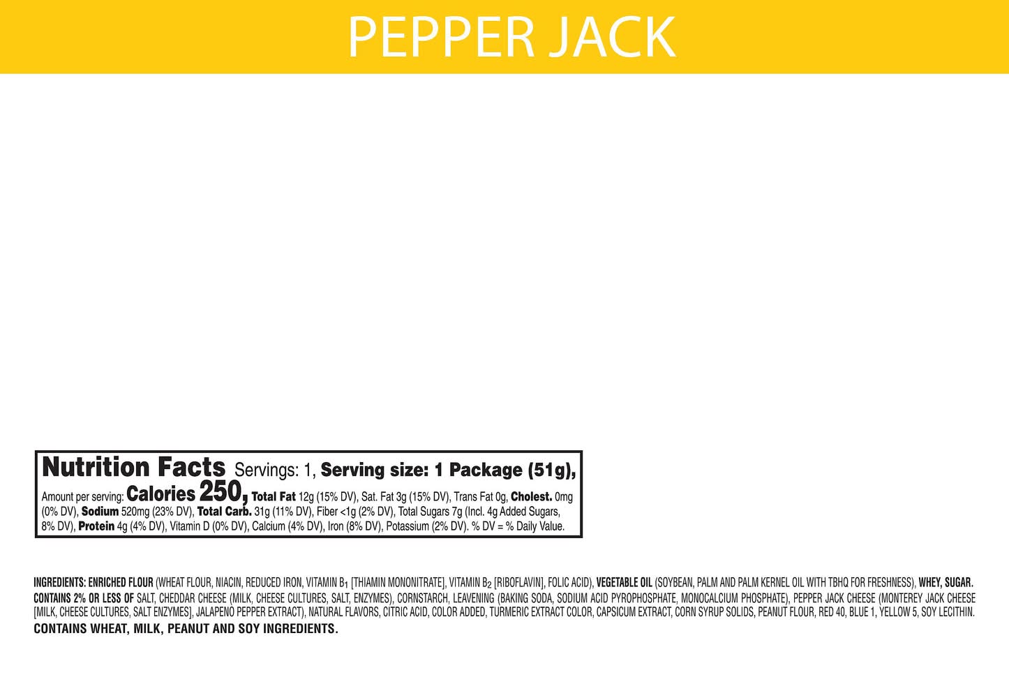 Ingredients: Enriched Flour (Wheat Flour, Niacin, Reduced Iron, Vitamin B1 [Thiamin Mononitrate], Vitamin B2 [Riboflavin], Folic Acid), Vegetable Oil (Soybean, Palm And Palm Kernel Oil With Tbhq For Freshness), Whey, Sugar. Contains 2% Or Less Of Salt, Cheddar Cheese (Milk, Cheese Cultures, Salt, Enzymes), Cornstarch, Leavening (Baking Soda, Sodium Acid Pyrophosphate, Monocalcium Phosphate), Pepper Jack Cheese (Monterey Jack Cheese [Milk, Cheese Cultures, Salt Enzymes], Jalapeno Pepper Extract), Natural Flavors, Citric Acid, Color Added, Turmeric Extract Color, Capsicum Extract, Corn Syrup Solids, Peanut Flour, Red 40, Blue 1, Yellow 5, Soy Lecithin. Contains: Contains wheat, milk, peanut and soy ingredients.