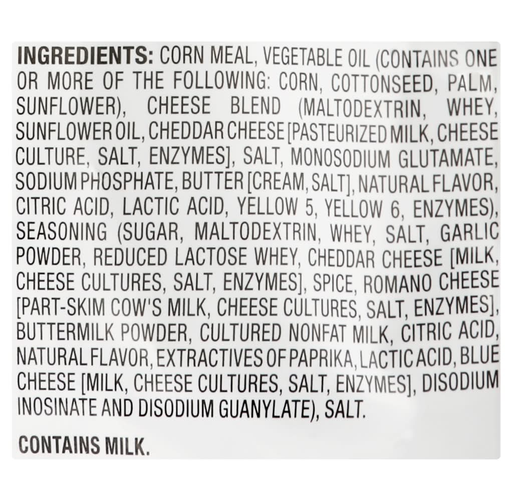 Ingredients: Corn Meal, Vegetable Oil (Contains One or More of the Following: Corn, Cottonseed, Palm, Sunflower), Cheese Blend (Maltodextrin, Whey, Sunflower Oil, Cheddar Cheese [Pasteurized Milk, Cheese Culture, Salt, Enzymes], Salt, Monosodium Glutamate, Sodium Phosphate, Butter [Cream, Salt], Natural Flavor, Citric Acid, Lactic Acid, Yellow 5, Yellow 6, Enzymes), Seasoning (Sugar, Maltodextrin, Whey, Salt, Garlic Powder, Reduced Lactose Whey, Cheddar Cheese [Milk, Cheese Cultures, Salt, Enzymes], Spice, Romano Cheese [Part-Skim Cow's Milk, Cheese Cultures, Salt, Enzymes], Buttermilk Powder, Cultured Nonfat Milk, Citric Acid, Natural Flavor, Extractives of Paprika, Lactic Acid, Blue Cheese [Milk, Cheese Cultures, Salt, Enzymes], Disodium Inosinate and Disodium Guanylate), Salt Contains: Milk, Lactose