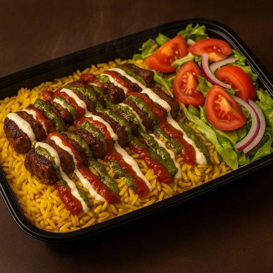 Savour tender, flame-grilled lamb chunks infused with authentic spices, served over a bed of fragrant yellow basmati rice and paired with a fresh, crunchy salad. Perfectly balanced, flavour-packed, and made to satisfy.