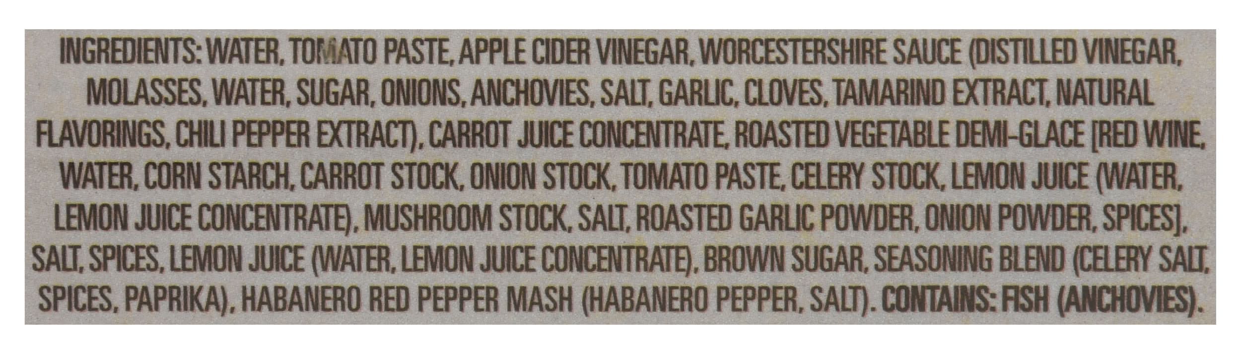 Ingredients: Water, Tomato Paste, Apple Cider Vinegar, Worcestershire Sauce (Distilled Vinegar, Molasses, Water, Sugar, Onions, Anchovies, Salt, Garlic, Cloves, Tamarind Extract, Natural Flavorings, Chili Pepper Extract), Carrot Juice Concentrate, Roasted Vegetable Demi-Glace [Red Wine, Water, Corn Starch, Carrot Stock, Onion Stock, Tomato Paste, Celery Stock, Lemon Juice (Water, Lemon Juice Concentrate), Mushroom Stock, Salt, Roasted Garlic Powder, Onion Powder, Spices], Salt, Spices, Lemon Juice (Water, Lemon Juice Concentrate), Brown Sugar, Seasoning Blend (Celery Salt, Spices, Paprika), Habanero Red Pepper Mash (Habanero Pepper, Salt) Contains: Fish, Anchovy, Corn, Celery