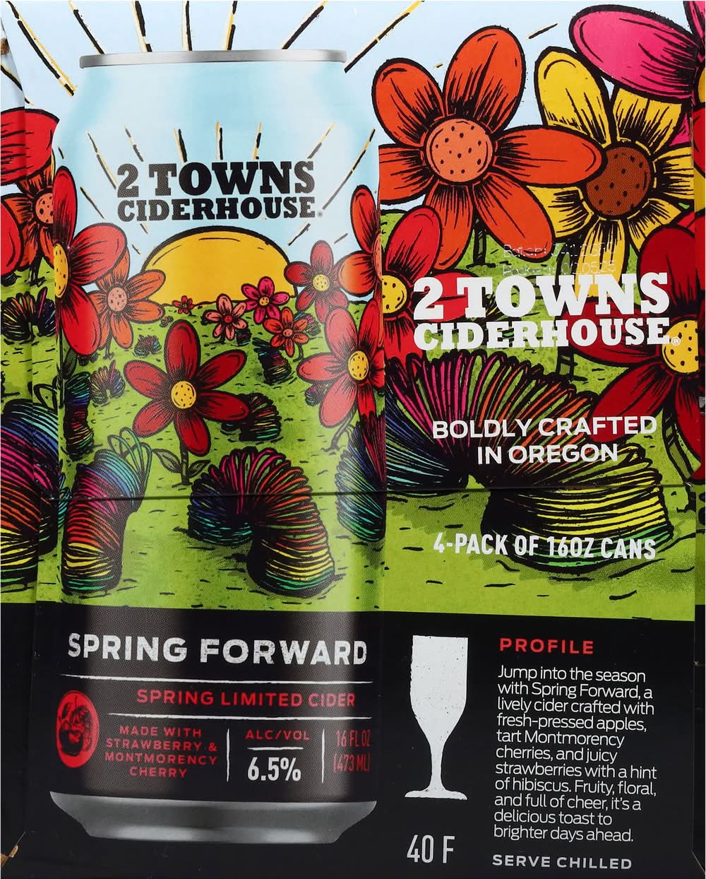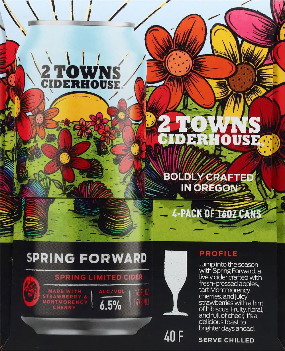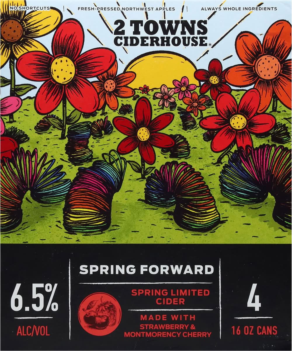 Spring Limited Cider Spring Forward Beer • Brand: 2 towns ciderhouse • Flavor: Strawberry-montmorency cherry • Pack size: 4 • gluten-free • Alcohol by volume: 6.5%